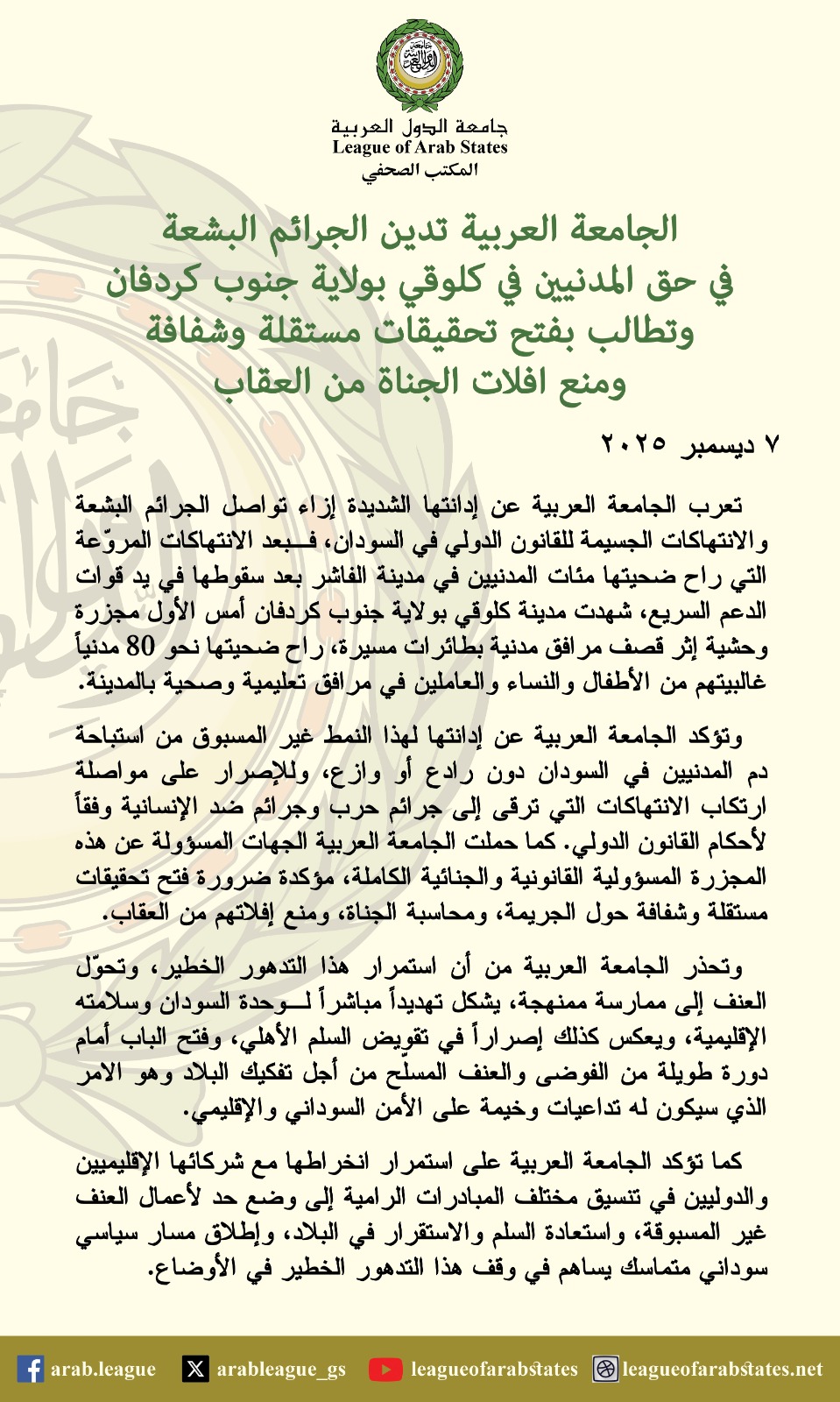 وأكدت الجامعة، في بيان رسمي اليوم الأحد 7 ديسمبر 2025، أن هذه الجريمة تأتي ضمن سلسلة من الانتهاكات الخطيرة التي شهدتها عدة مناطق سودانية، بما فيها مدينة الفاشر التي سقطت مؤخراً في يد قوات الدعم السريع، وما صاحب ذلك من قتل مئات المدنيين وارتكاب انتهاكات جسيمة للقانون الدولي.