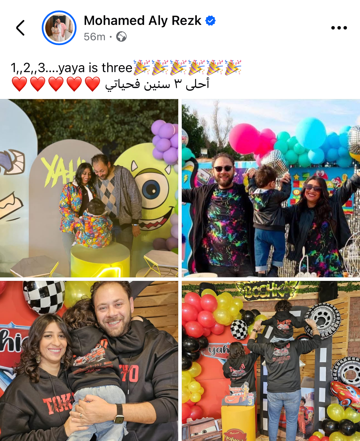 احتفل الفنان محمد علي رزق بمناسبة عيد ميلاد نجله الثالث، حيث قام بنشر صور للعائلة، عبر حسابه الشخصي بموقع فيسبوك، وعلق عليها قائلاً: “أحلى ٣ سنين في حياتي”.