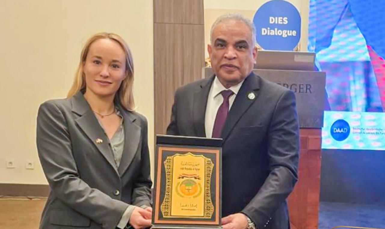 وعلى هامش المشاركة أهدى الدكتور محمد حسين درع الجامعة للسفير الألماني بالقاهرة، وتسلمه نيابة عنه Hannah Brandt السكرتير الاول ومسئول العلوم والمراسم.