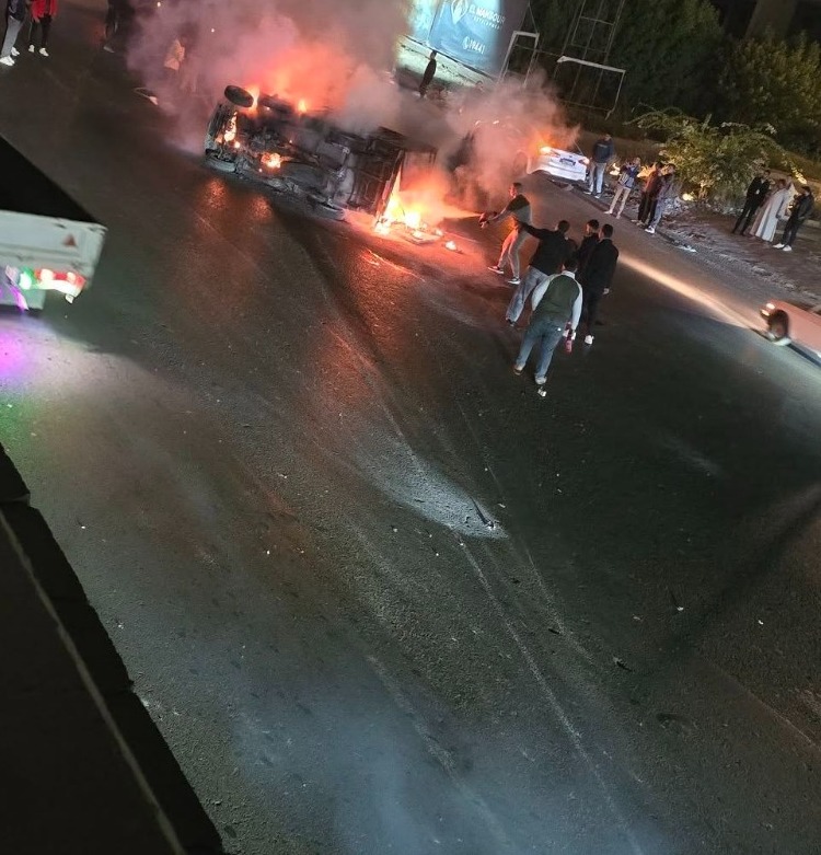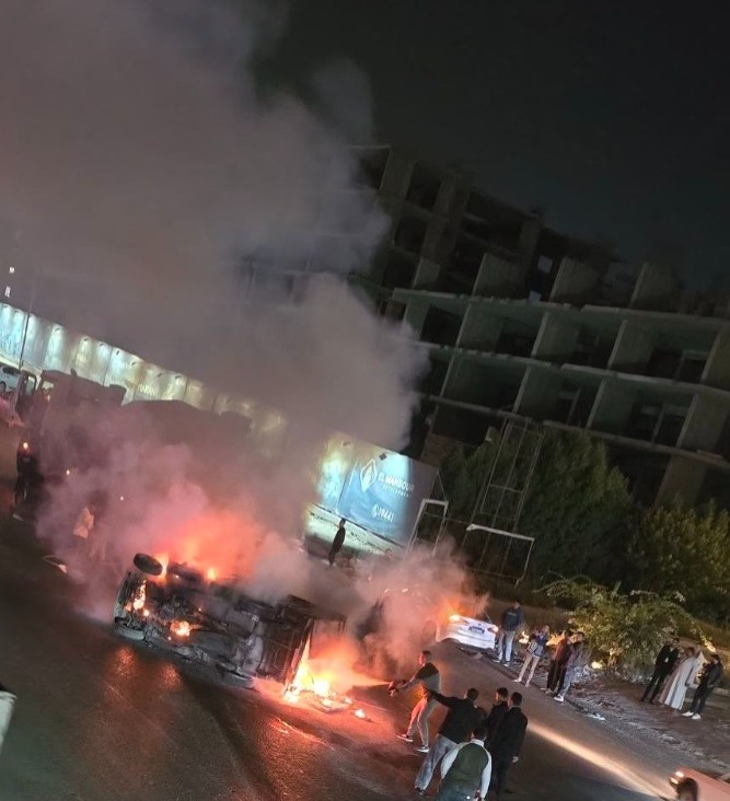 انقلاب سيارة وتفحمها على الطريق في القطامية