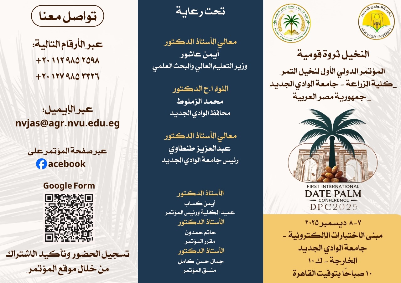 انطلقت اليوم فعاليات المؤتمر الدولي الأول لنخيل التمر تحت شعار "النخيل ثروة قومية" بكلية الزراعة – جامعة الوادي الجديد، وذلك خلال الفترة من 7 إلى 8 ديسمبر 2025 بمبنى الاختبارات الإلكترونية بالجامعة، بمشاركة عربية واسعة من المملكة العربية السعودية والعراق وليبيا والأردن، تونس. إلى جانب نخبة من الباحثين والمتخصصين من مصر.