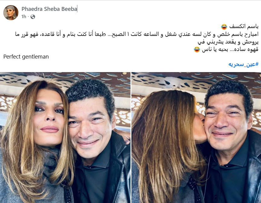 "باسم اتكسف… امبارح خلص تصوير بدري، لكن أنا كان باقيلي مشاهد، وكانت الساعة واحدة بعد منتصف الليل، وكنت بنام وأنا قاعدة. فقرر مايمشيش ويستنى معايا، وقعد يشربني قهوة سادة لحد ما خلصت. بحبه يا ناس… فعلاً الرجل المثالي."