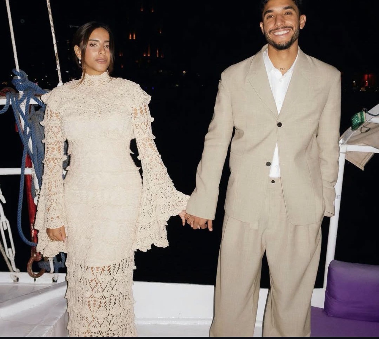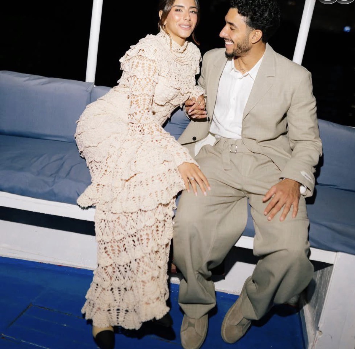 وظهرت خطيبته رفقته فى مركب فى النيل، مرتدية فستانا أنيقا ومحتشما باللون الاوف وايت واتسم بقماش التريكو.