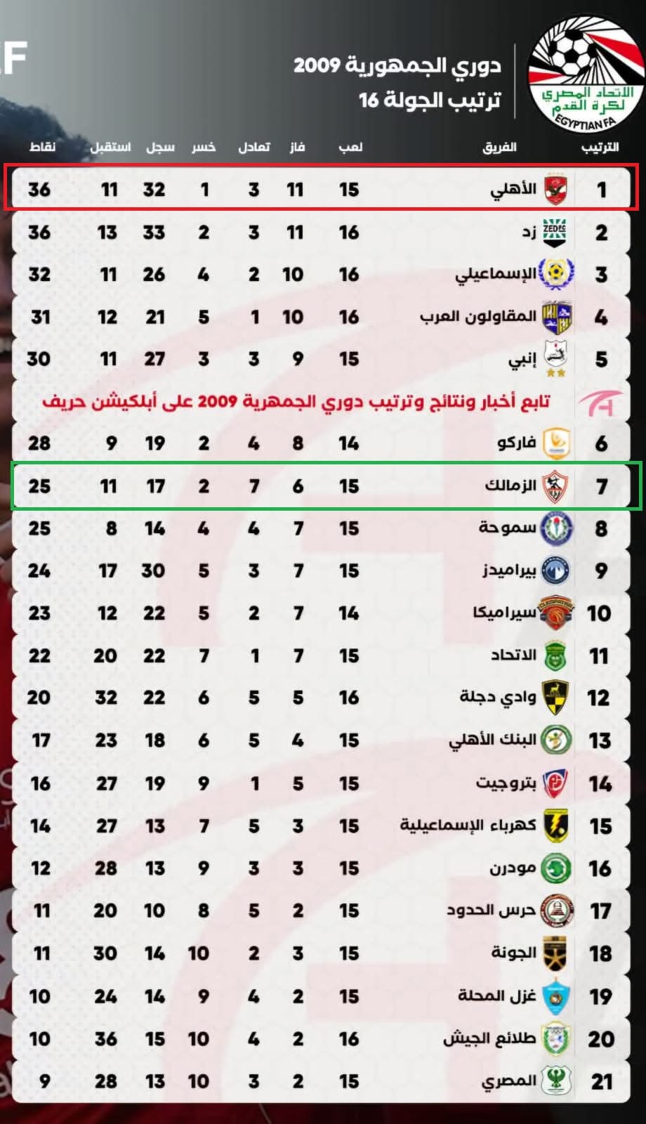 دوري 2009 : الأهلي في المركز الأول والزمالك في المركز السابع !!