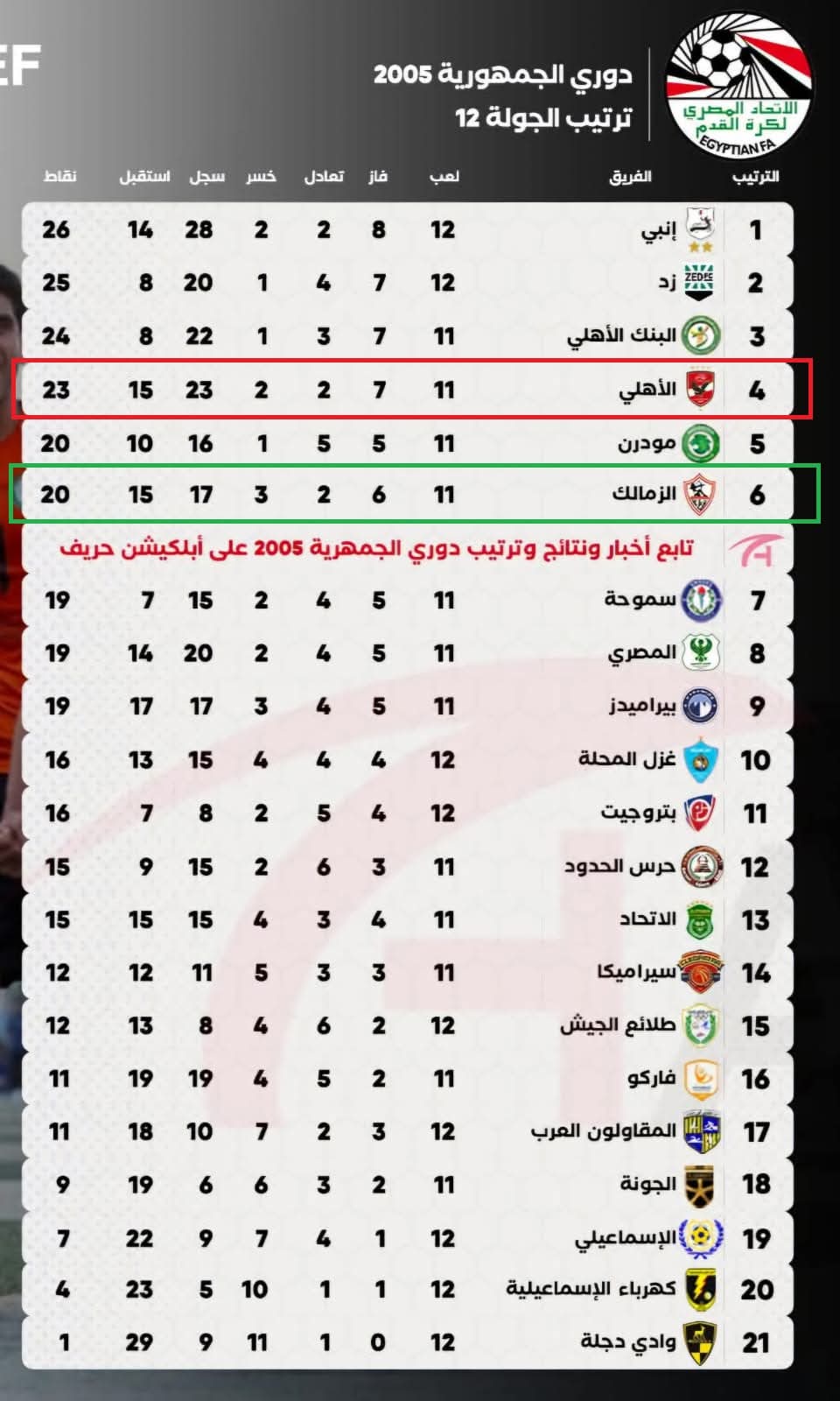دوري 2005 : الأهلي في المركز الرابع وله مباراة مؤجلة في حال الفوز بها سيصعد للمركز الأول ، والزمالك في المركز السادس !!