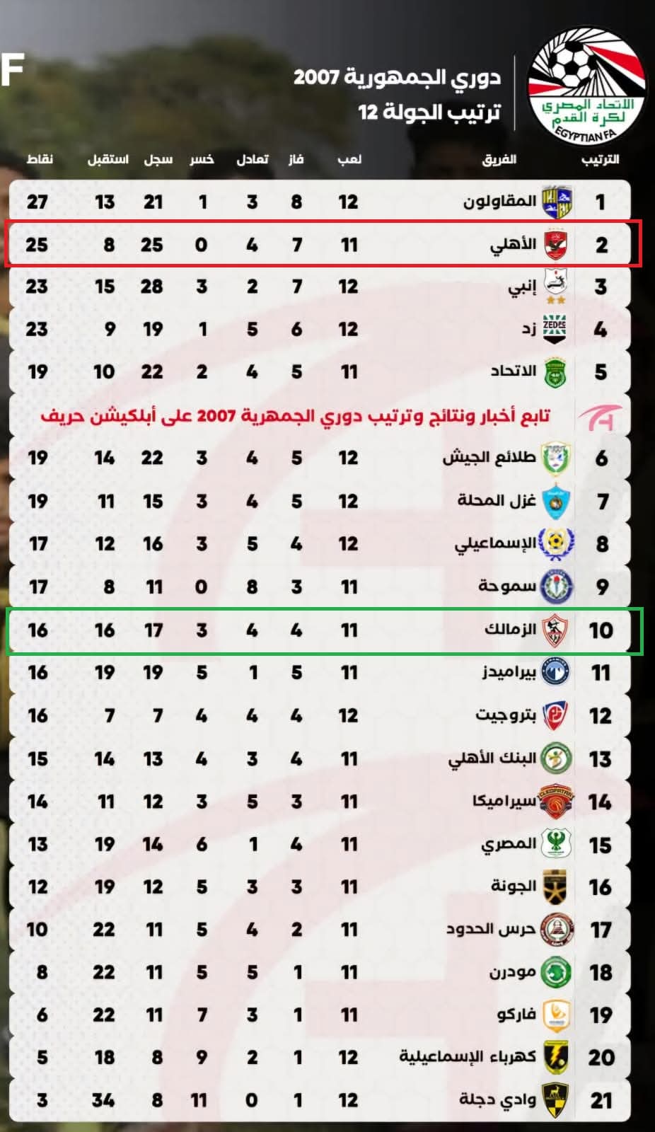 دوري 2007 : الأهلي في المركز الثاني وله مباراة مؤجلة في حال الفوز بها سيصعد للمركز الأول ، والزمالك في المركز العاشر !!