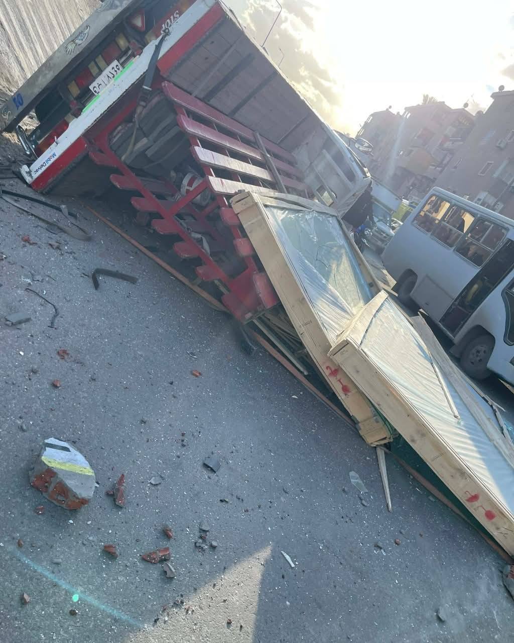 بالانتقال والفحص تبين من المعاينة والتحريات إصابة شخصين في انقلاب سيارة نقل من أعلى الطريق إلى حارة المرور السفلى وجرى رفع حطام الحادث وتسيير الحركة المرورية.