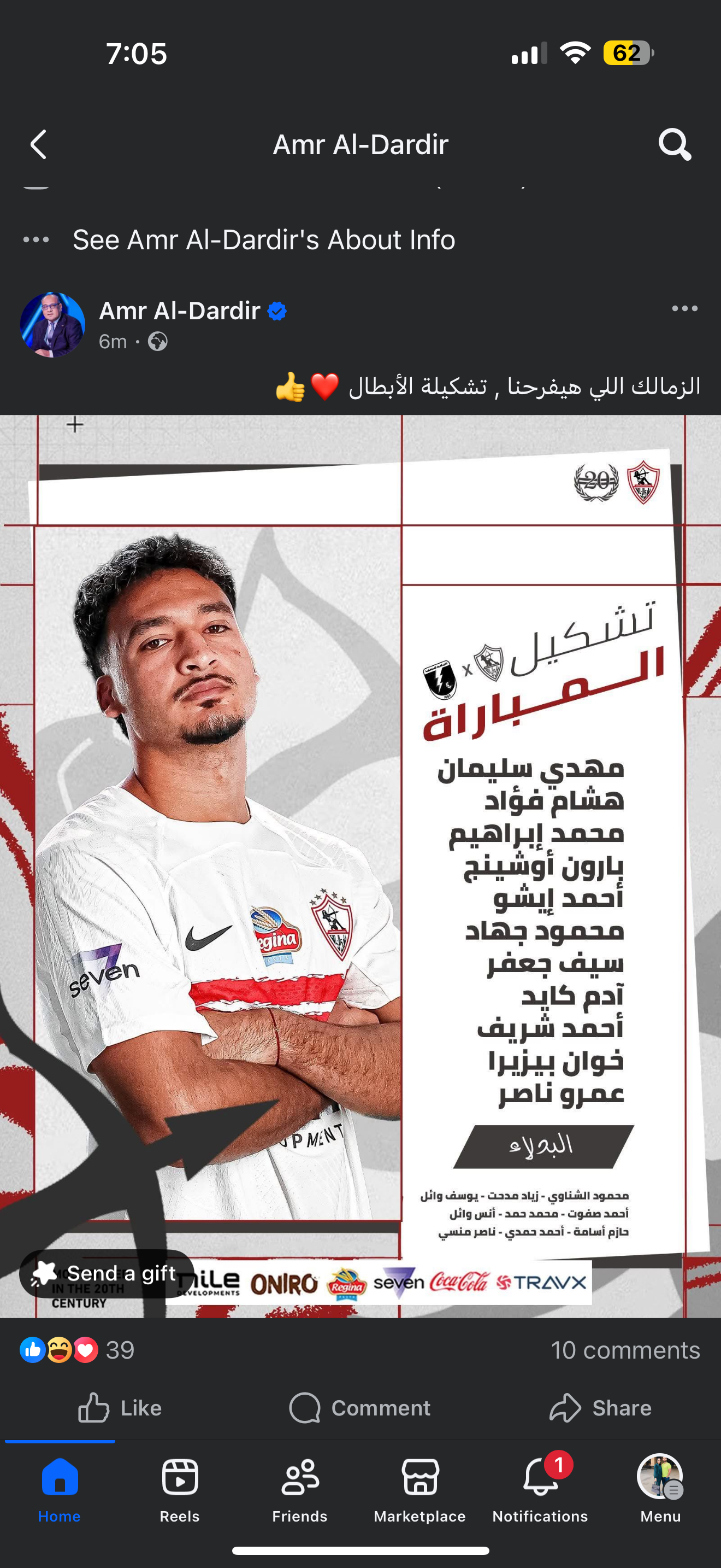 نشر الناقد الرياضي عمرو الدردير تشكيل الزمالك عبر حسابه الشخصي بموقع التواصل الإجتماعي فيسبوك.