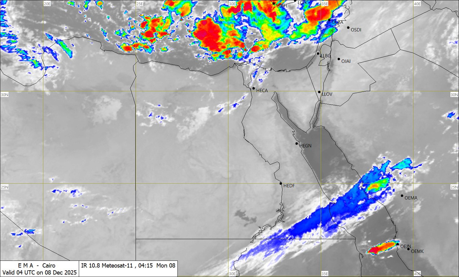 حول فرص أمطار متوسطة تكون غزيرة ورعدية أحيانًا على مناطق من محافظات: الإسكندرية، البحيرة، كفر الشيخ، الدقهلية، دمياط، بورسعيد، الغربية، المنوفية، الشرقية، ومدن القناة، مع احتمال وصول السيول إلى مناطق من سيناء على فترات متقطعة.