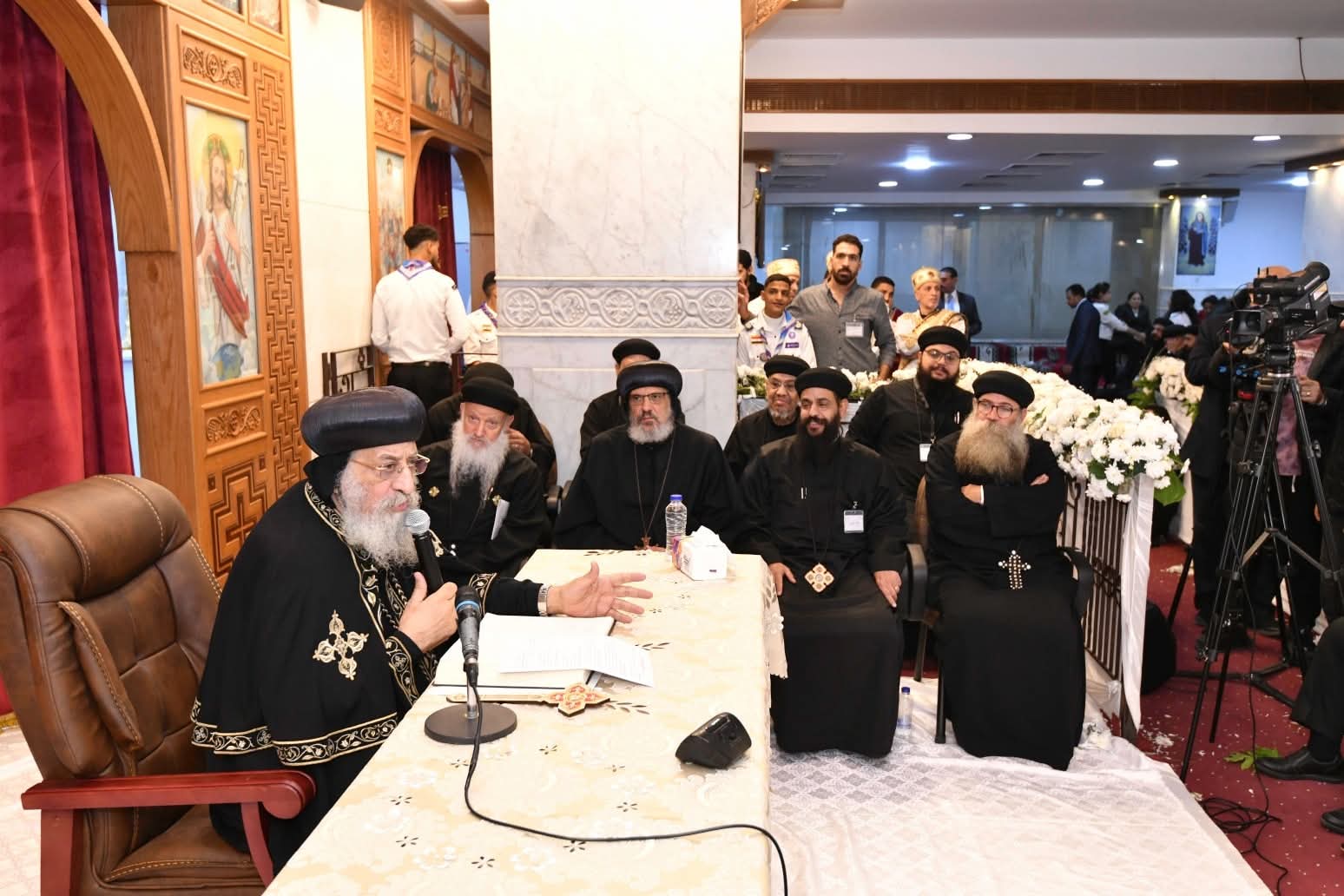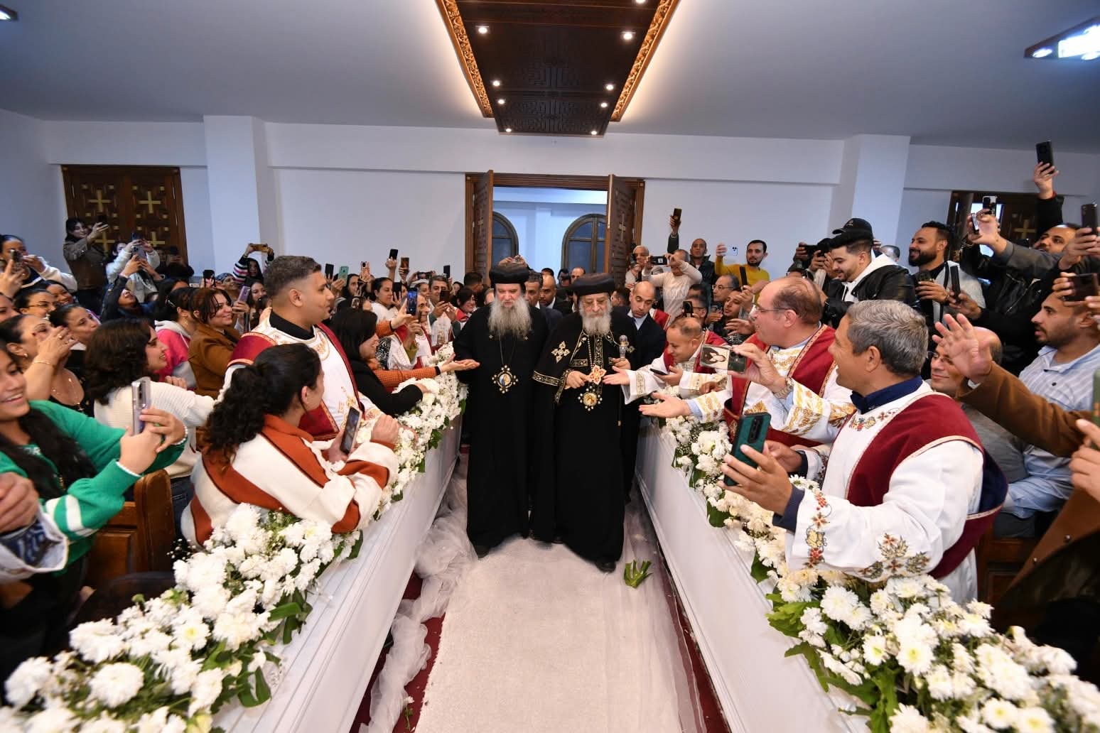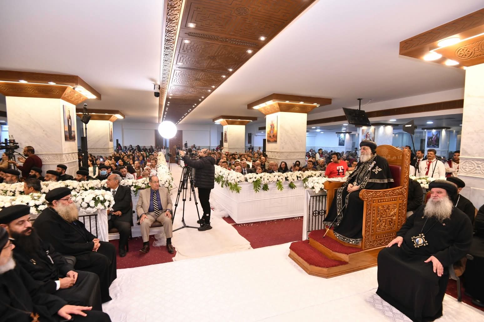 وامتلأ السرادق المقام في الساحة أمام الكنيسة بفريق الكشافة والمئات من أبناء الكنيسة، حيث اُستُقبِل قداسته لدى وصوله، بحفاوة بالغة من قبلهم، وعلت أصواتهم بكلمات الترحيب والمحبة، وحرص قداسته على مبادلتهم التحية.