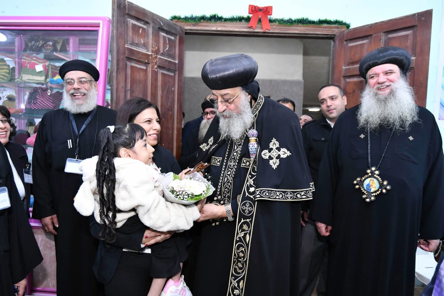 كما اصطف مجموعة من أطفال مدارس الأحد، لاستقبال قداسة البابا على باب الكنيسة الخارجي وعلى بابها الداخلي أيضًا وقدم بعض الأطفال باقات الورود لقداسته، ثم توسط قداسته آباء الكنيسة ومجلسها العاملين بها لالتقاط صورة تذكارية معه.