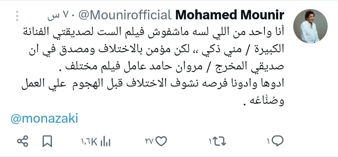 وكتب محمد منير علي صفحته علي موقع التواصل x:"أنا واحد من اللي لسه ماشفوش فيلم الست لصديقتي الفنانة الكبيرة مني زكي، لكن مؤمن بالاختلاف ومصدق في ان صديقي المخرج مروان حامد عامل فيلم مختلف .