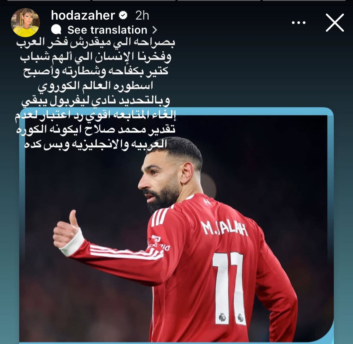 وكتبت هدى زاهر عبر ستوري حسابها على انستجرام: “بصراحة اللي ميقدرش فخر العرب وفخرنا.. الانسان اللي ألهم شباب كتير بكفاحه وشطارته وأصبح اسطورة العالم الكروي وبالتحديد نادي ليفربول يبقى إلغاء متابعة وأقوى رد اعتبار لعدم تقدير محمج صلاح ايقونة الكرة العربية والانجليزية”.