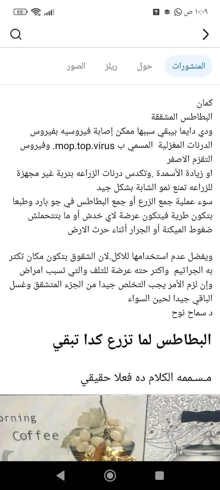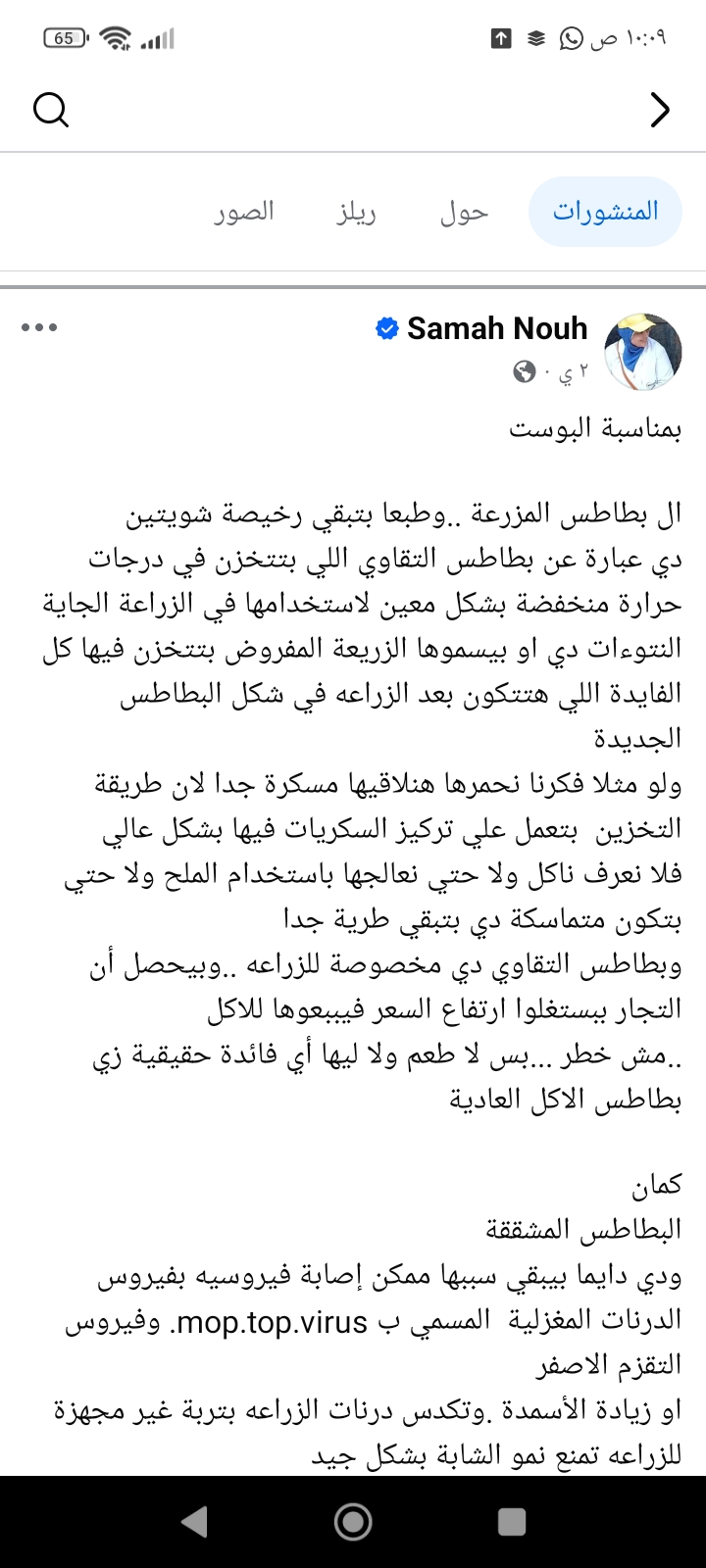 حذرت الدكتورة سماح نوح رئيس قسم الإرشاد البيطري على صفحتها الشخصية بالفيسبوك من البطاطس، إذ أن هناك أنواع معينة من البطاطس التي لا تصلح للأكل، مؤكدة أن بطاطس التقاوي المخصصة للزراعة والبطاطس المشققة قد تكون ضارة أو عديمة الفائدة عند الطهي، ومشددة على ضرورة التعامل معها بحذر وغسلها جيدًا قبل الاستخدام إذا لزم الأمر.
