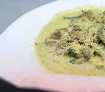 يشوح الثوم مع الزبدة ثم يضاف أوراك الدجاج ثم بهارات و الملح و الفلفل، ثم يضاف الريحان الطازج ثم الزبادي و الكريمة و الجبنة الرومي.