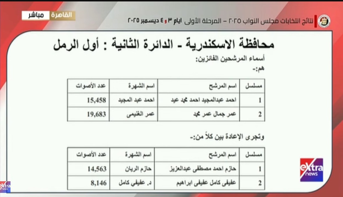 أعلن القاضي حازم بدوي، رئيس الهيئة الوطنية للانتخابات، نتائج انتخابات مجلس النواب في 19 دائرة ملغاة بقرار من الهيئة.