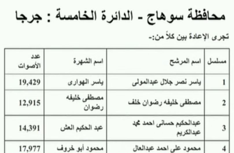 والإعادة بين 4 مرشحين بالدائرة الأولى سوهاج وهم :علاء الدين قدري – حازم ذكي – دياب محمد – علي مصطفى