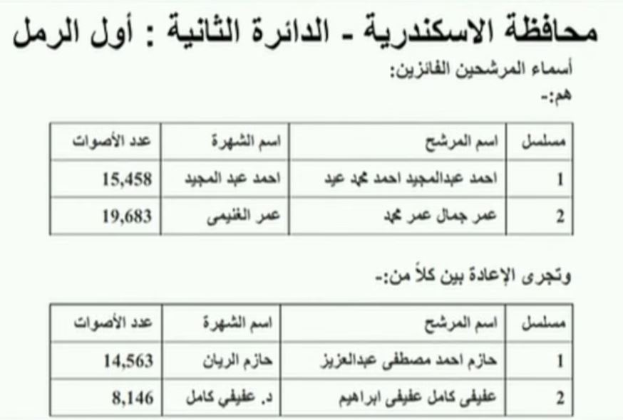 أعلن رئيس الهيئة فوز مرشحين والإعادة بين اثنين آخرين بالدائرة الثانية أول الرمل بالإسكندرية وهم: الفائزان أحمد عبدالمجيد – عمر جمال – إعادة بين حازم أحمد – عفيفي كامل