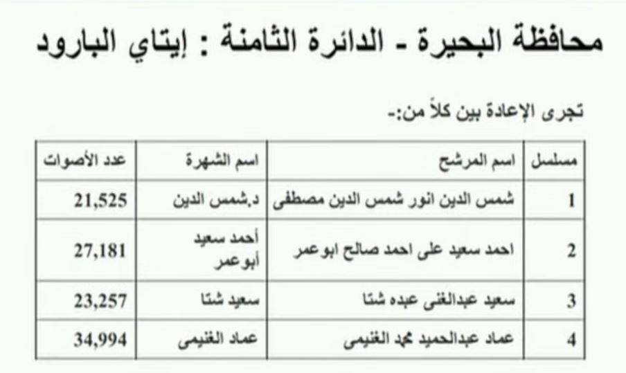 الإعادة بين 6 مرشحين بالدائرة الأولى دمنهور بالبحيرة وهم : إعادة بين سناء أنور – طه زكريا – علاء محمد – محمود إبراهيم – رضا محمود – محمد عبدالوهاب
