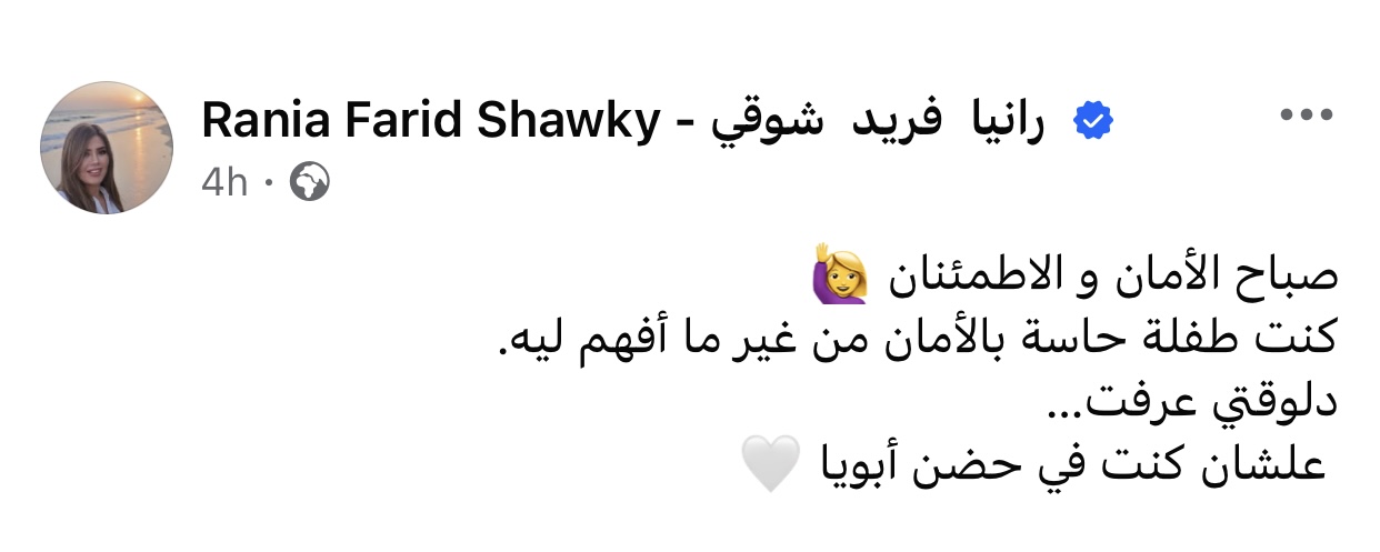 وعلقت رانيا فريد شوقي على الصور قائلة: “صباح الأمان والاطمئنان، كنت طفلة حاسة بالأمان من غير ما افهم ليه، دلوقتي عرفت، علشان كنت في حضن أبويا”.