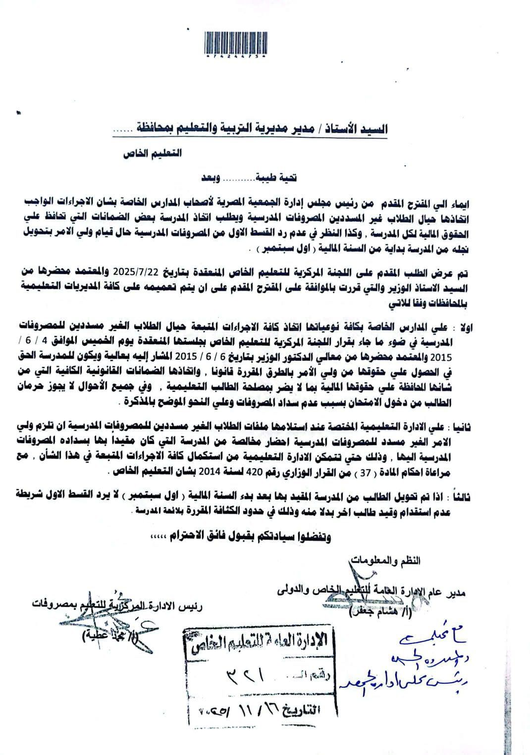 وافقت وزارة التربية والتعليم والتعليم الفني، على الطلب المقدمم من رئيس مجلس ادارة الجمعية المصرية لأصحاب المدارس الخاصة بشأن الإجراءات الواجب اتخاذها حيال الطلاب غير المسددين المصروفات المدرسية حال قيام ولي الامر بتحويل نجله من المدرسة بداية من السنة المالية (أول سبتمبر)