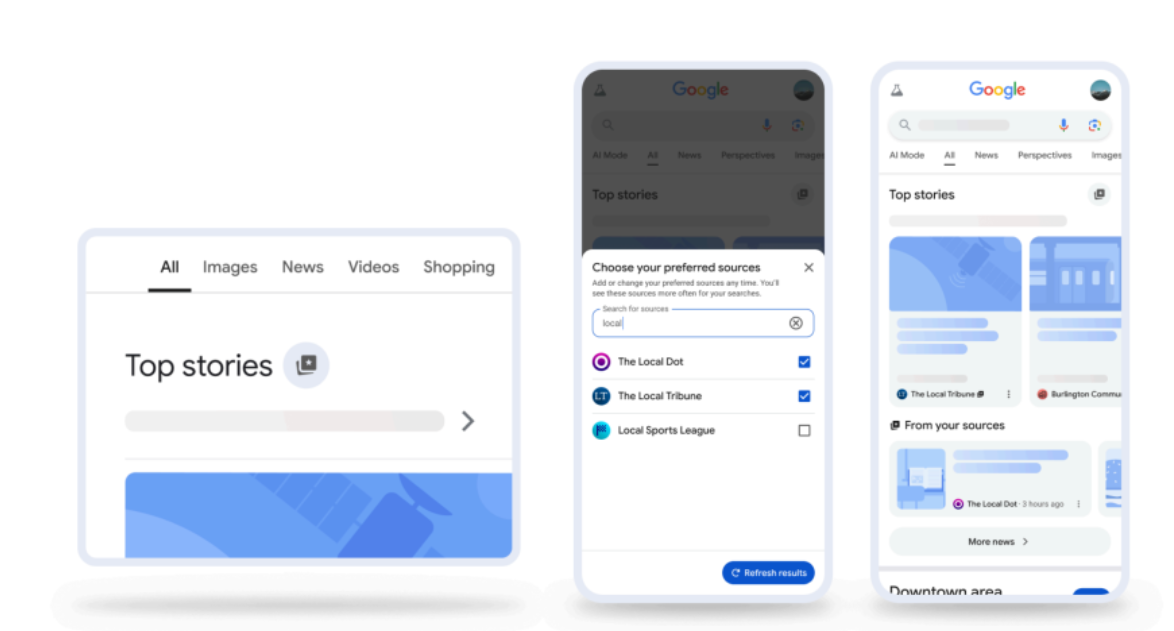 كما تتيح هذه الميزة للمستخدمين اختيار مواقع الأخبار والمدونات المفضلة لديهم لظهورها في قسم "القصص الرئيسية" في نتائج بحث جوجل.