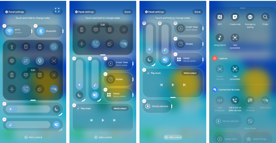 بعد تقديم One UI 8 للوحة سريعة منقسمة للإعدادات السريعة، جاء تحديث One UI 8.5 ليمنح المستخدمين تحكما أكبر، أصبحت اللوحة الآن قابلة للتخصيص بالكامل، مما يتيح للمستخدم تعديل ترتيب كل أزرار التحكم والمنزلقات، مع واجهة مستخدم محدثة لإضافة المزيد من الأدوات.
