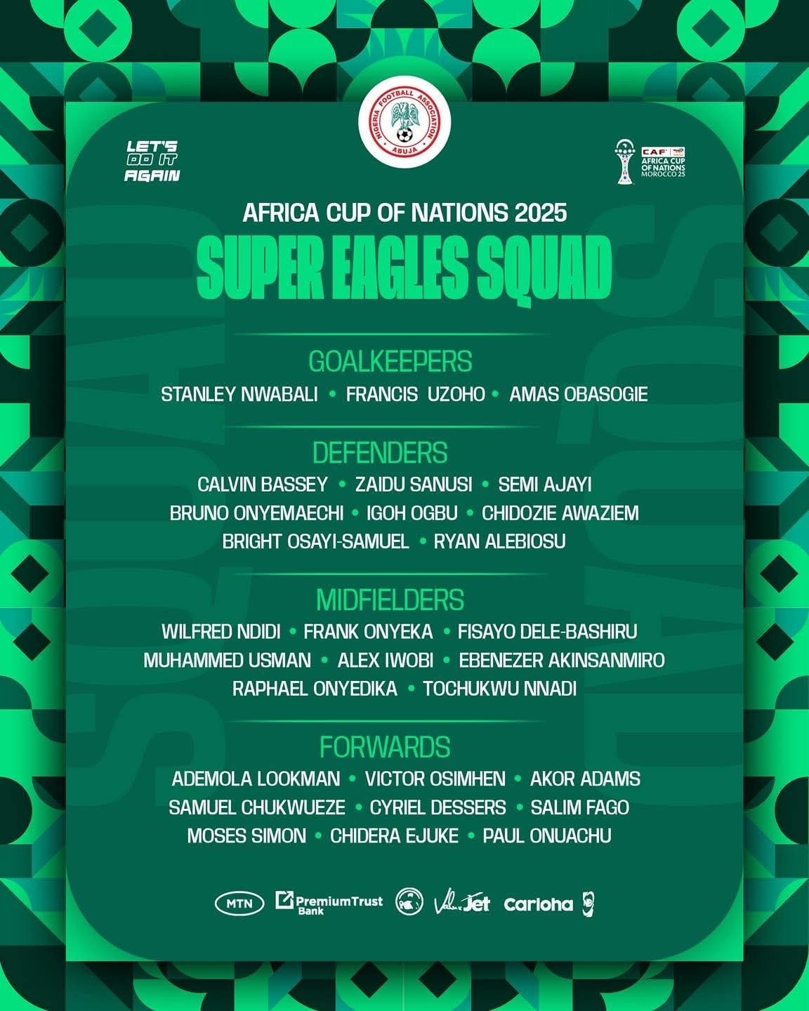 كشف الجهاز الفني لمنتخب نيجيريا الأول عن القائمة الرسمية التي ستخوض بطولة كأس الأمم الأفريقية المقرر إقامتها في المغرب خلال الفترة من 21 ديسمبر 2025 وحتى 18 يناير 2026، حيث يشارك 24 منتخباً في النسخة المقبلة من البطولة القارية.