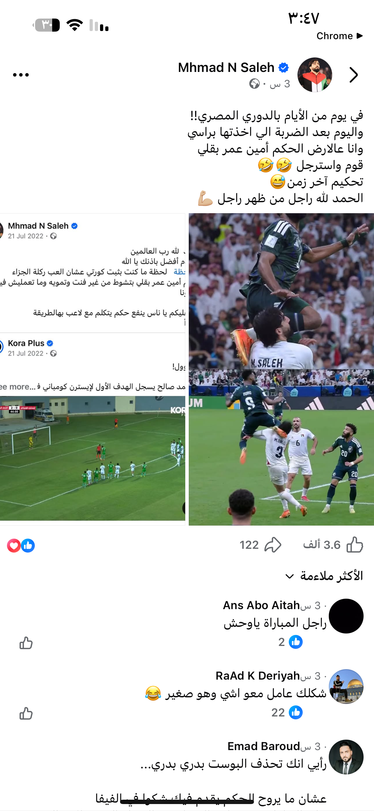 شنّ اللاعب الفلسطيني محمد صالح، لاعب منتخب فلسطين ونادي إيسترن كومبي، والهجوم السابق للنادي المصري البورسعيدي، هجوماً حاداً على الحكم أمين عمر الذي أدار مباراة ربع نهائي كأس العرب بين فلسطين والسعودية، والتي انتهت بفوز الأخضر 2-1.