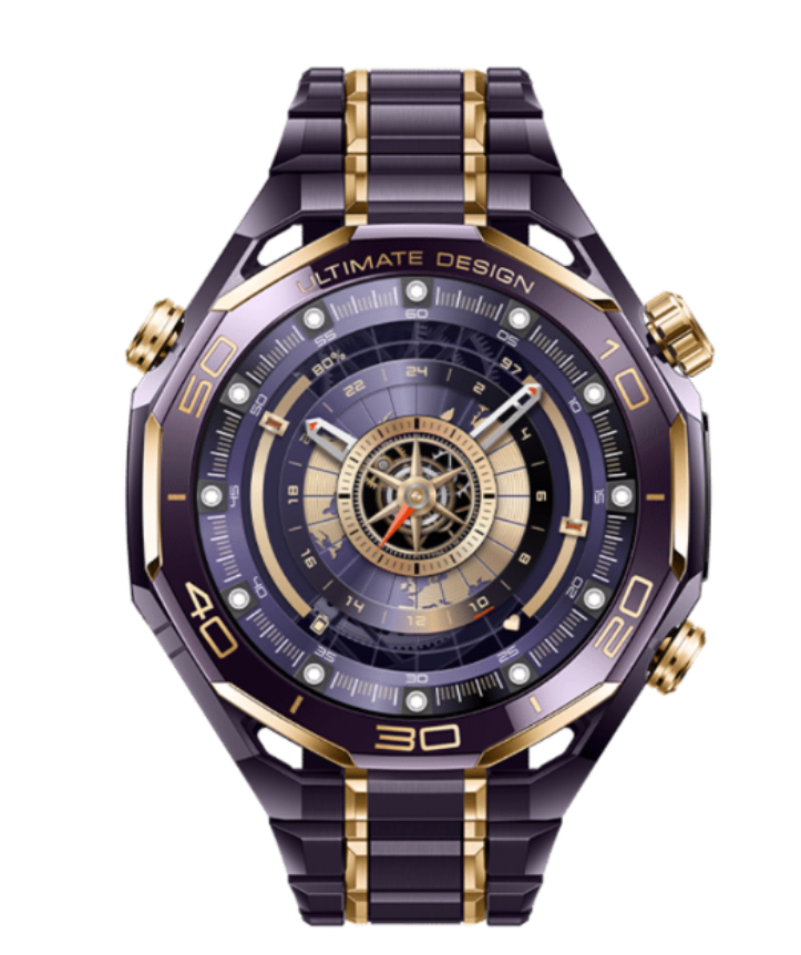 أطلقت هواوي أيضا ساعة WATCH ULTIMATE DESIGN - Royal Gold Edition التي تمزج بين المواد الفاخرة والأداء المتين، تتميز الساعة بحافة خزفية بنفسجية نادرة، تفاصيل ذهب 18 قيراط، صندوق سائل معدني مبني على الزركونيوم، وسوار من تيتانيوم بنفسجي-ذهبي.