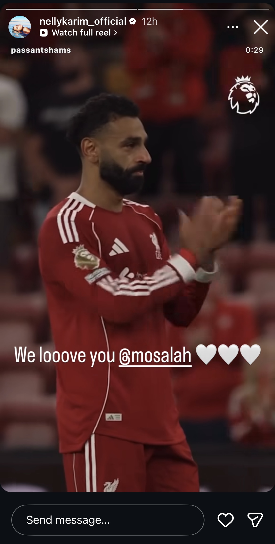 وكتبت نيللي كريم عبر ستوري حسابها على انستجرام: “بنحبك يا محمد صلاح”.