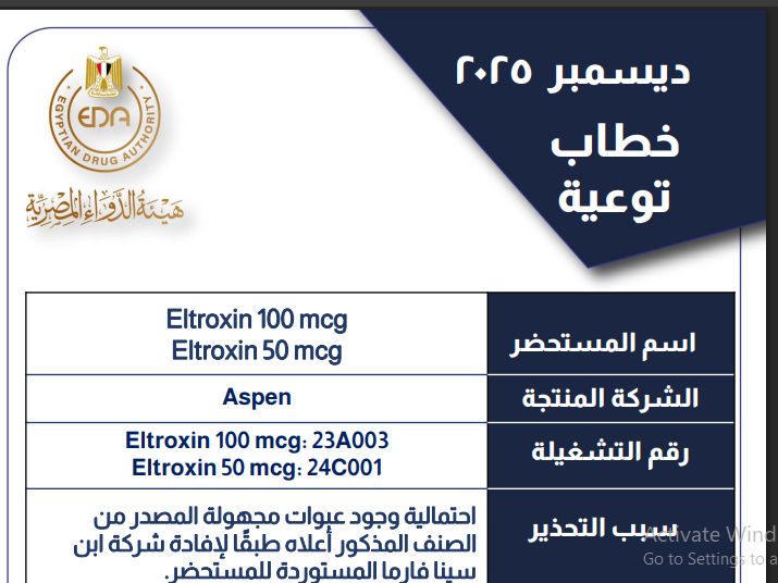 وأوضحت هيئة الدواء المصرية أن الدواء المذكور يحمل إسم «Eltroxin 100 mcg - Eltroxin 50 mcg » ، تشغيلات أرقام