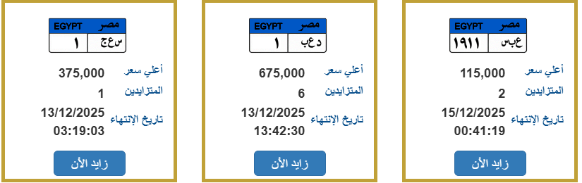 ومن ضمن اللوحات التي تتم عليها المُزايدة لوحة تحمل رقم (د ع ب- 1)، ووصل سعرها حتى الآن لـ675 ألف جنيه وينتهي المزايدة عليها يوم 13-12-2025 ويتنافس عليها 6 أشخاص فقط حتى الآن.