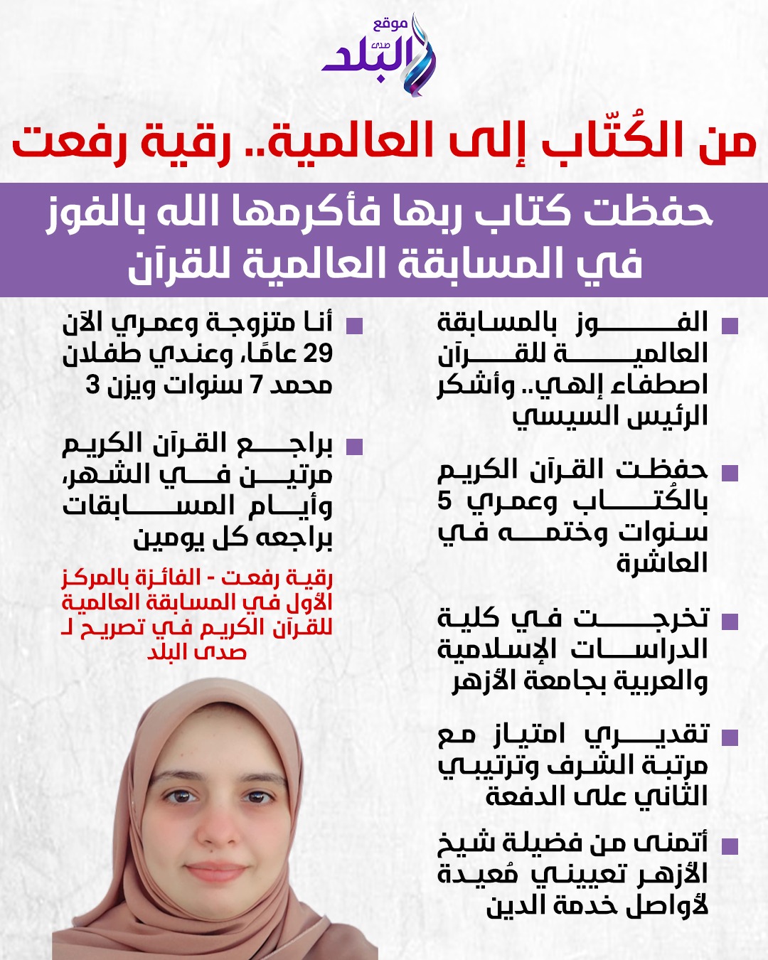 وقالت «رقية» في تصريح لـ«صدى البلد»: «بدأت حفظ القرآن الكريم وعمري 5 سنوات، وأتممت حفظه وعمري 10 سنوات، وتخرجت في كلية الدراسات الإسلامية والعربية بجامعة الأزهر بالإسكندراية، وحصلت على تقدير امتياز مع مرتبة الشرف عام 2018م.