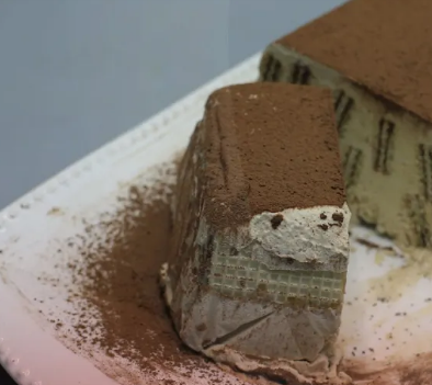 ضع ملعقة كبيرة ممتلئة من الكريمة على أحد جانبي كل قطعة بسكويت ورتبها بإحكام في القالب من جانب طويل إلى الآخر، مكونًا 3 إلى 4 صفوف من نحو 10 قطع لكل صف. (يجب أن يقف البسكويت على حافته، بحيث عند تقطيع الكيك النهائي عرضيًا، تحصل على نمط مخطط جميل).