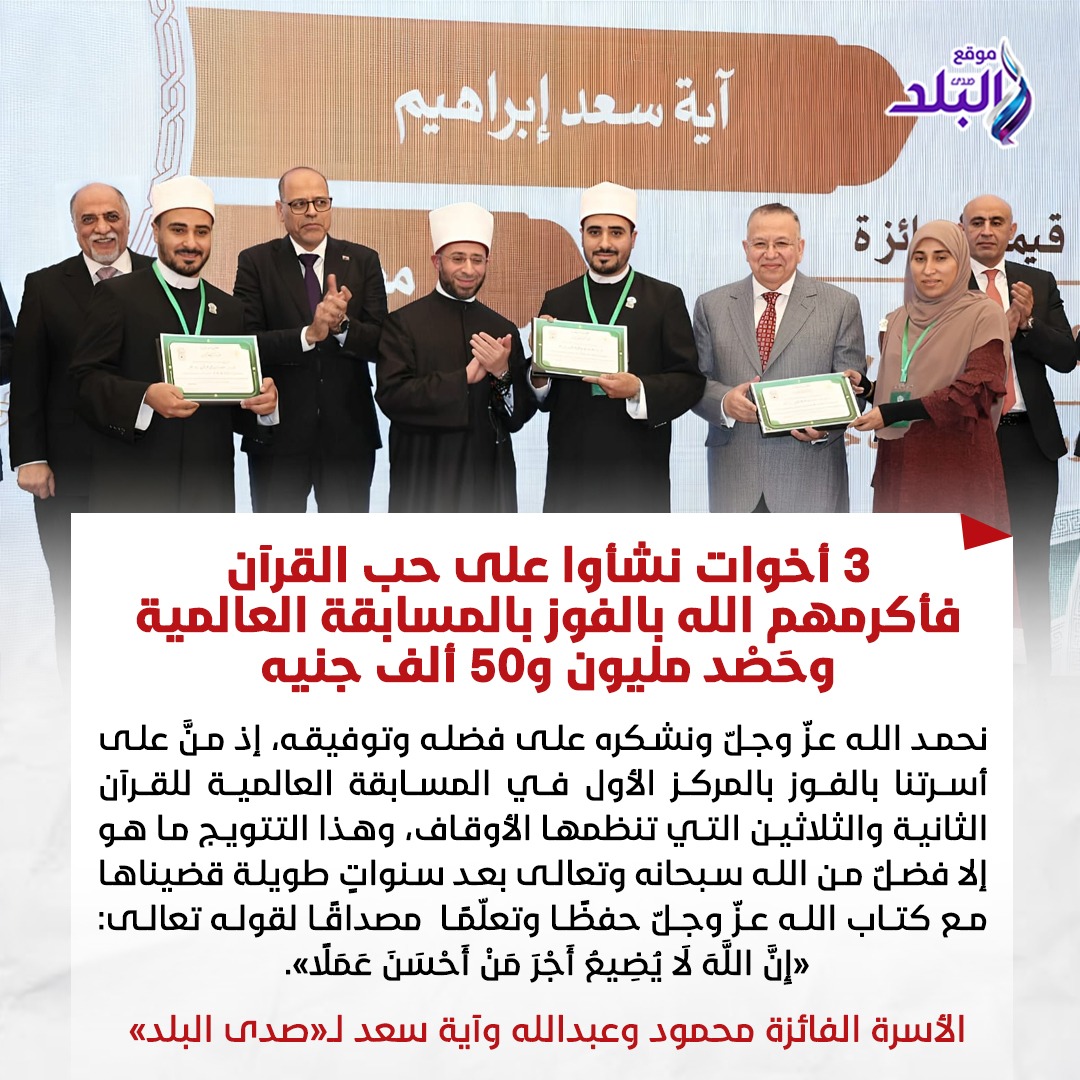 وقالت الأسرة الفائزة محمود وعبدالله وآية سعد لـ«صدى البلد»: «نحمد الله عزّ وجلّ ونشكره على فضله وتوفيقه، إذ منَّ على أسرتنا بالفوز بالمركز الأول في المسابقة العالمية للقرآن الثانية والثلاثين التي تنظمها الأوقاف، وهذا التتويج ما هو إلا فضلٌ من الله سبحانه وتعالى بعد سنواتٍ طويلة قضيناها مع كتاب الله عزّ وجلّ حفظًا وتعلّمًا مصداقًا لقوله تعالى: «إِنَّ اللَّهَ لَا يُضِيعُ أَجْرَ مَنْ أَحْسَنَ عَمَلًا».