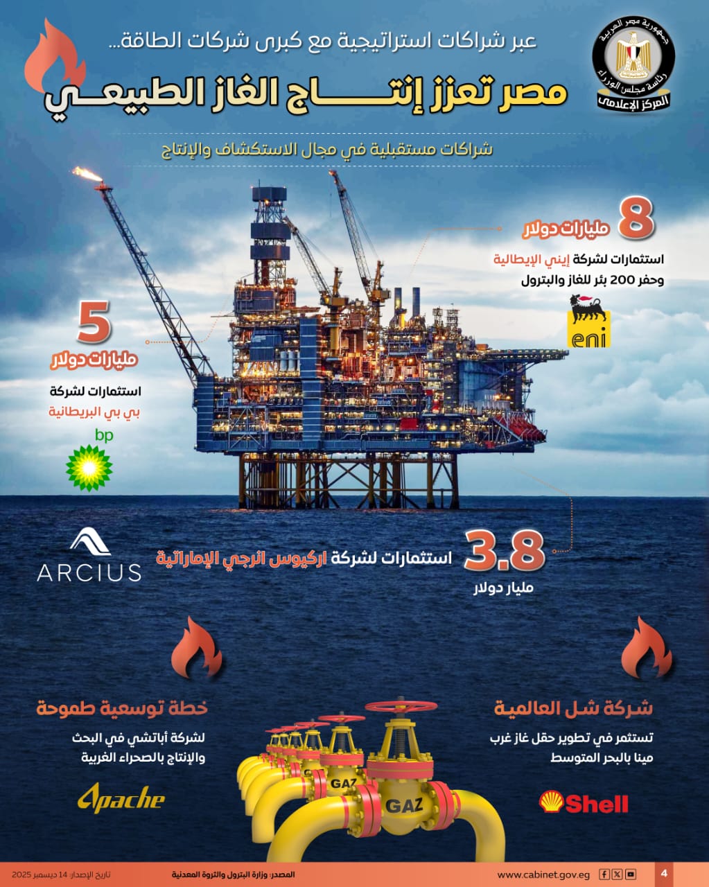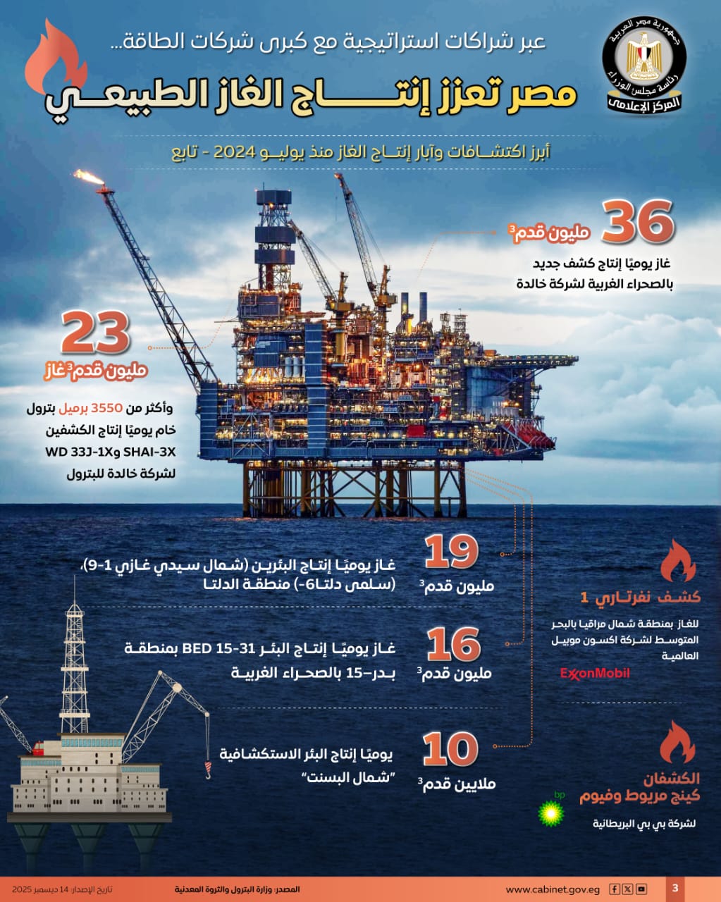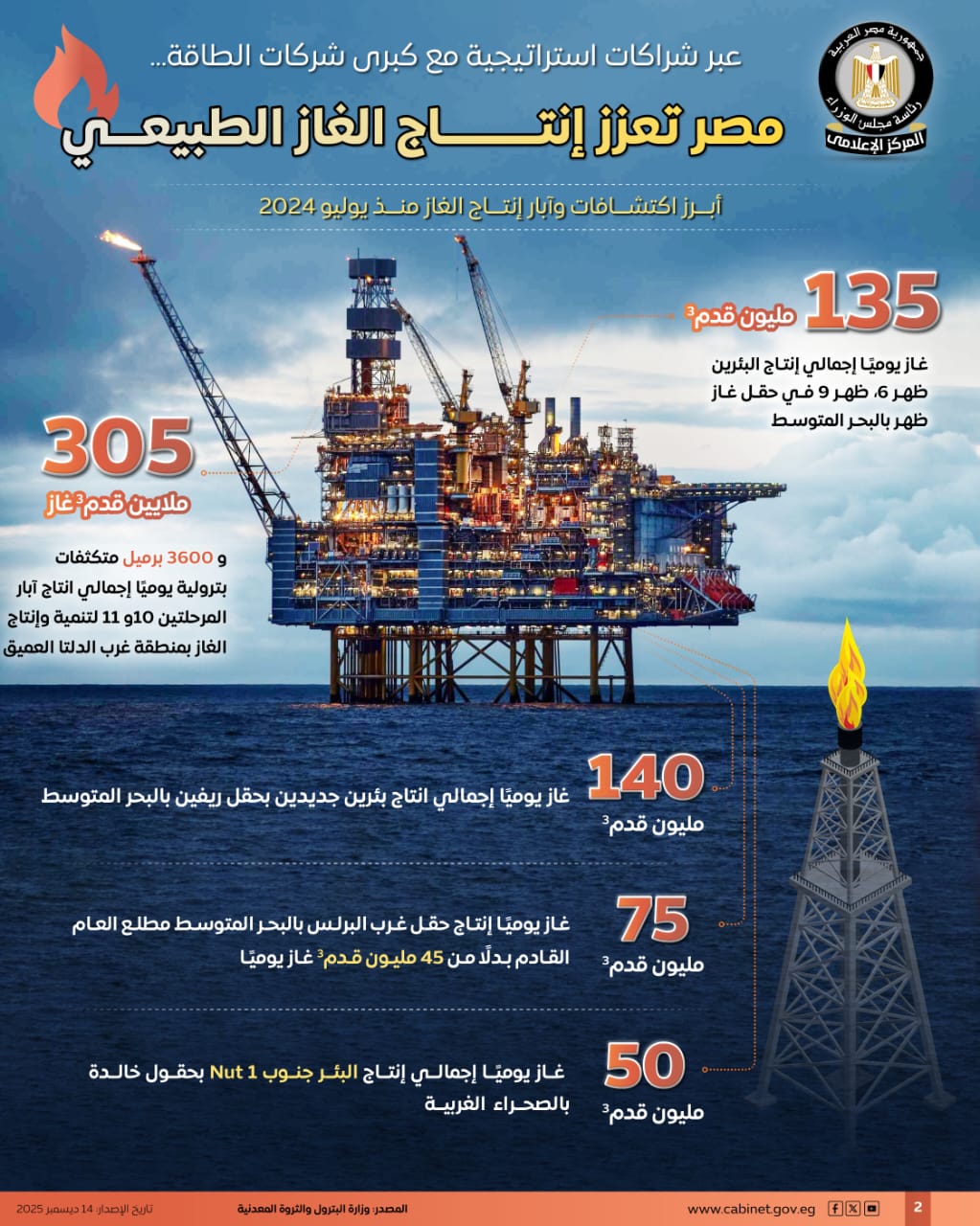 نشر المركز الإعلامي لمجلس الوزراء عددًا من الإنفوجرافات عبر منصاته على مواقع التواصل الاجتماعي، سلط من خلالها الضوء على جهود الدولة لتعزيز إنتاج الغاز الطبيعي عبر شراكات استراتيجية مع كبرى شركات الطاقة.