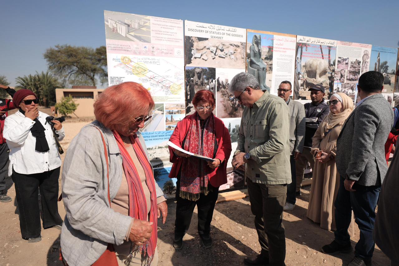 وفي معبد الملك أمنحتب الثالث تفقد السيد الوزير ومرافقوه ما تم من أعمال حفائر وتوثيق وترميم لعناصر المعبد خلال السنوات الماضية وما تم إعادة تركيبه وإقامته من تماثيل ولوحات من نتاج أعمال الحفائر بالموقع.