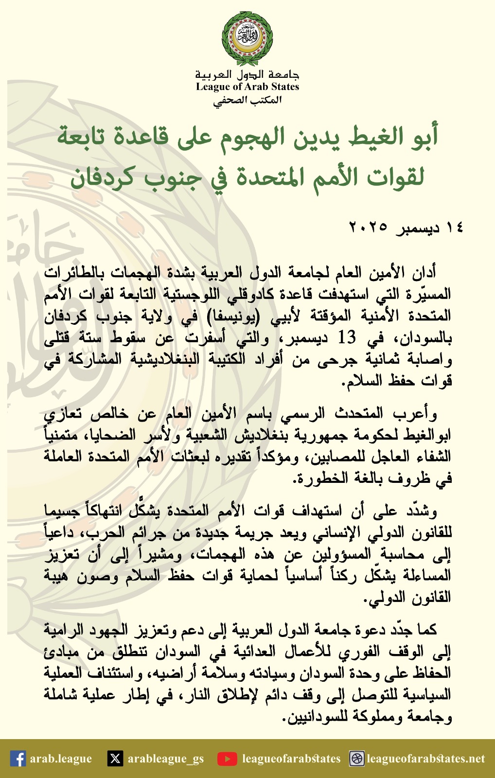 أدان الأمين العام لجامعة الدول العربية بشدة الهجمات بالطائرات المُسيرة التي استهدفت قاعدة كادوقلي اللوجستية التابعة لقوات الأمم المتحدة الأمنية المؤقتة لأبيي (يونيسفا) في ولاية جنوب كردفان بالسودان، في 13 ديسمبر، والتي أسفرت عن سقوط ستة قتلى وإصابة ثمانية جرحى من أفراد الكتيبة البنغلاديشية المشاركة في قوات حفظ السلام.
