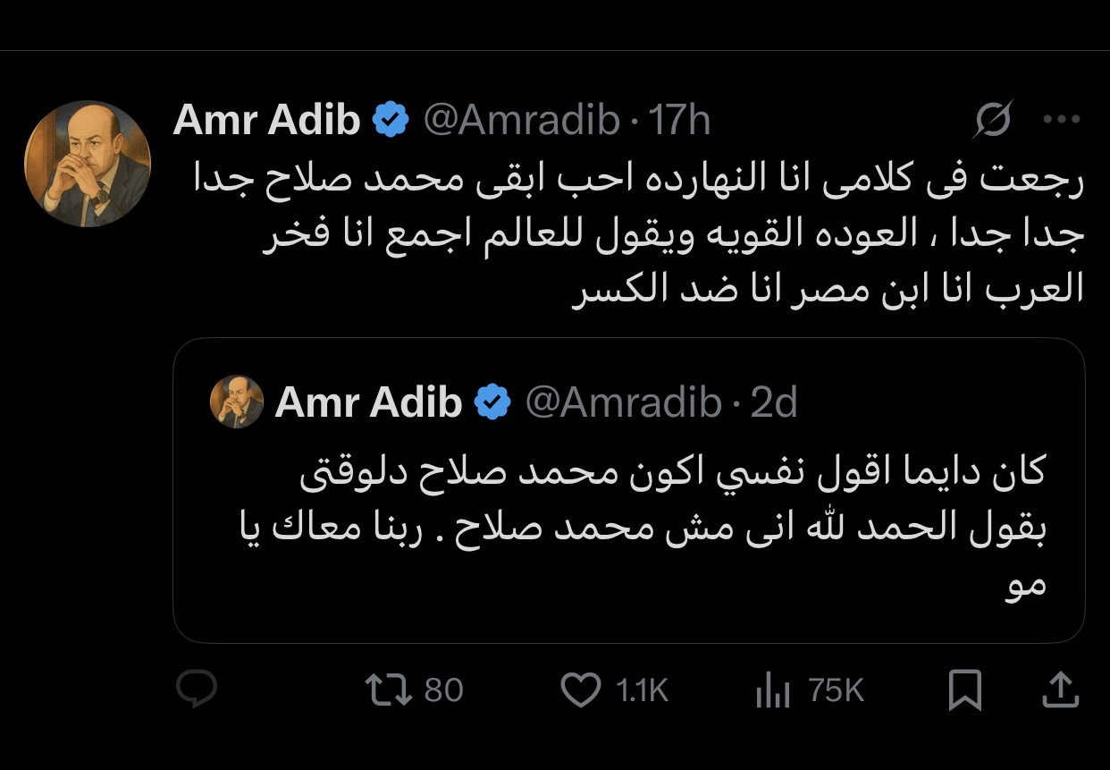 تراجع الإعلامي عمرو أديب عن رسالته الأخيرة التي وجهها لمحمد صلاح عبر حسابه الشخصي بموقع إكس والتي قال فيها: "كنت دايما أقول: نفسي أكون محمد صلاح.. دلوقتي بقول: الحمد لله إني مش محمد صلاح.. ربنا معاك يا مو".