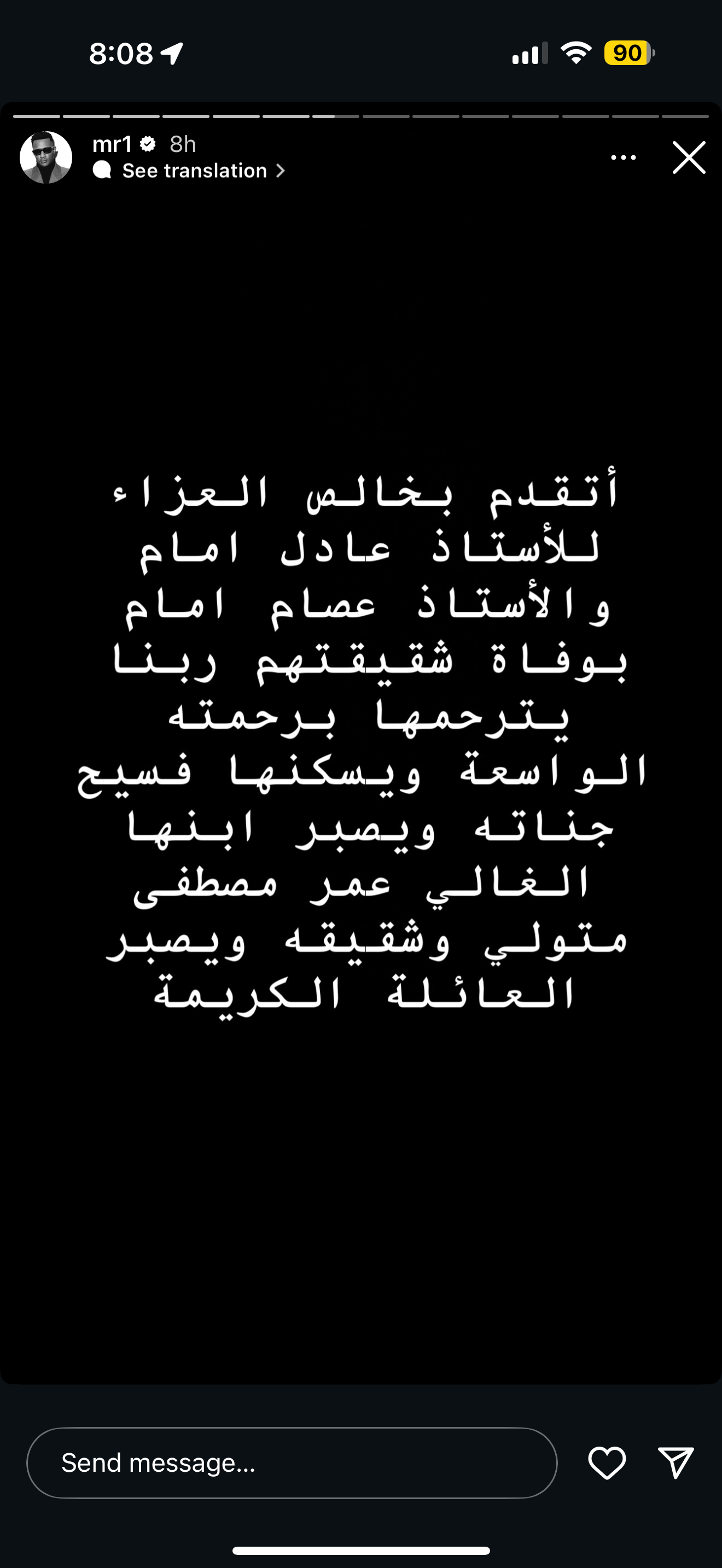 وكتب محمد رمضان، عبر خاصية «ستوري» على حسابه الرسمي بموقع إنستجرام: «أتقدم بخالص العزاء للأستاذ عادل وعصام إمام لوفاة شقيقتهما، ربنا يرحمها ويصبر ابنها الغالي عمر مصطفى متولي وشقيقه، ويصبر العائلة الكريمة».