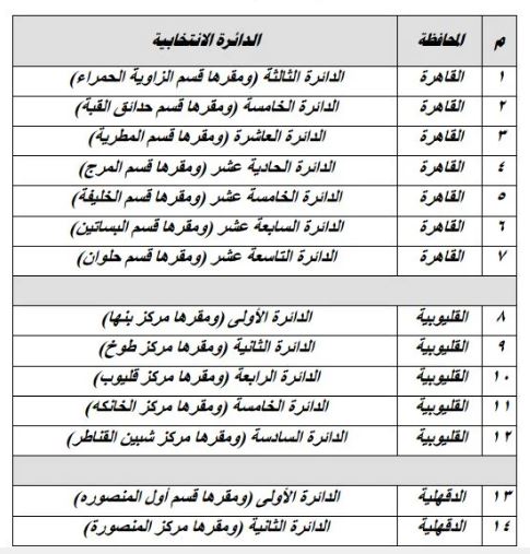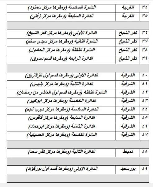 وفى محافظة الشرقية بالدائرة الأولى «أول الزقازيق»، الدائرة الثانية «بلبيس»، الدائرة الثالثة «أول العاشر من رمضان»، الدائرة الخامسة «أبو كبير»، الدائرة السادسة «ديرب نجم»، الدائرة السابعة «فاقوس»، الدائرة الثامنة «أبو حماد»، الدائرة التاسعة «الحسينية».