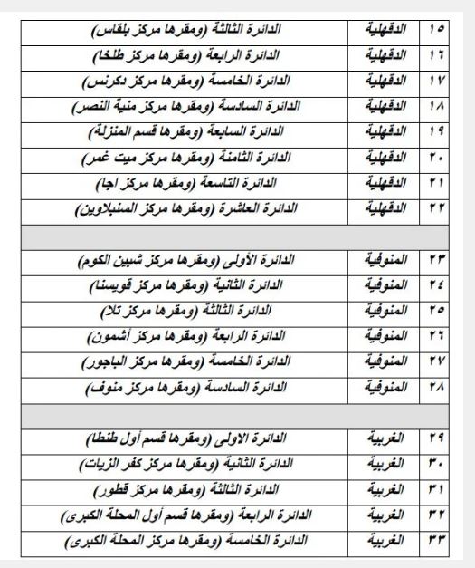 كما تجرى الإعادة في محافظة المنوفية فى الدائرة الأولى «شبين الكوم»، الدائرة الثانية «قويسنا»، الدائرة الثالثة «تلا»، الدائرة الرابعة «أشمون»، الدائرة الخامسة «الباجور»، الدائرة السادسة «منوف»، وفى محافظة الغربية بالدائرة الأولى «أول طنطا»، الدائرة الثانية «كفر الزيات»، الدائرة الثالثة «قطور»، الدائرة الرابعة «أول المحلة الكبرى»، الدائرة الخامسة «المحلة الكبرى»، الدائرة السادسة «سمنود»، الدائرة السابعة «زفتى»، وفى محافظة كفر الشيخ بالدائرة الأولى «كفر الشيخ»، الدائرة الثانية «سيدى سالم»، الدائرة الثالثة «الحامول»، الدائرة الرابعة «دسوق»،