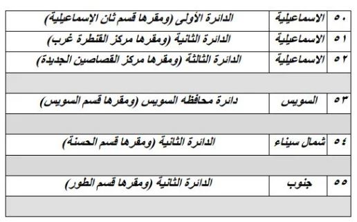 وفى محافظة دمياط بالدائرة الثانية «كفر سعد»، وفى محافظة بورسعيد بالدائرة الأولى «أول بور فؤاد» وفى محافظة الإسماعيلية بالدائرة الأولى «ثان الإسماعيلية»، الدائرة الثانية «القنطرة غرب»، الدائرة الثالثة «القصاصين الجديدة»، وفى محافظة السويس بالدائرة الأولى «السويس»، وفى محافظة شمال سيناء بالدائرة الثانية «الحسنة»، وفى محافظة جنوب سيناء بالدائرة الثانية «الطور».