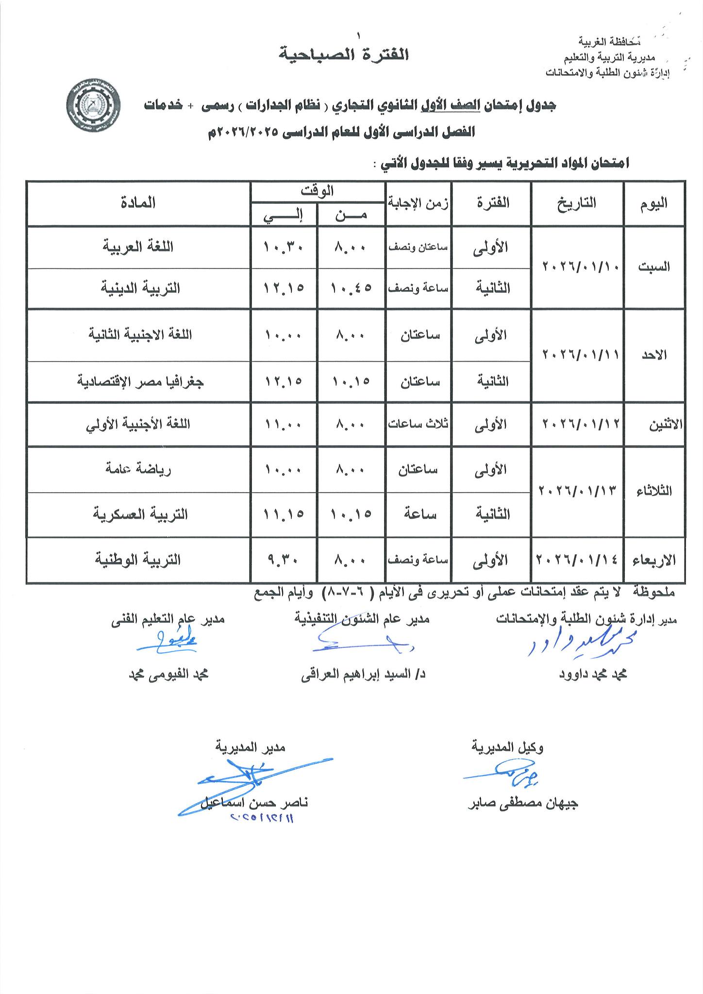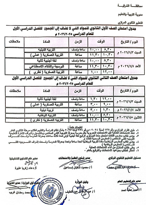 وراعت مديريات التربية والتعليم والتعليم الفني عند وضع جدول امتحانات نصف العام 2026 ، عدم عقد أي امتحانات في أيام الأعياد تنفيذا لتعليمات وزير التربية والتعليم والتعليم الفني .