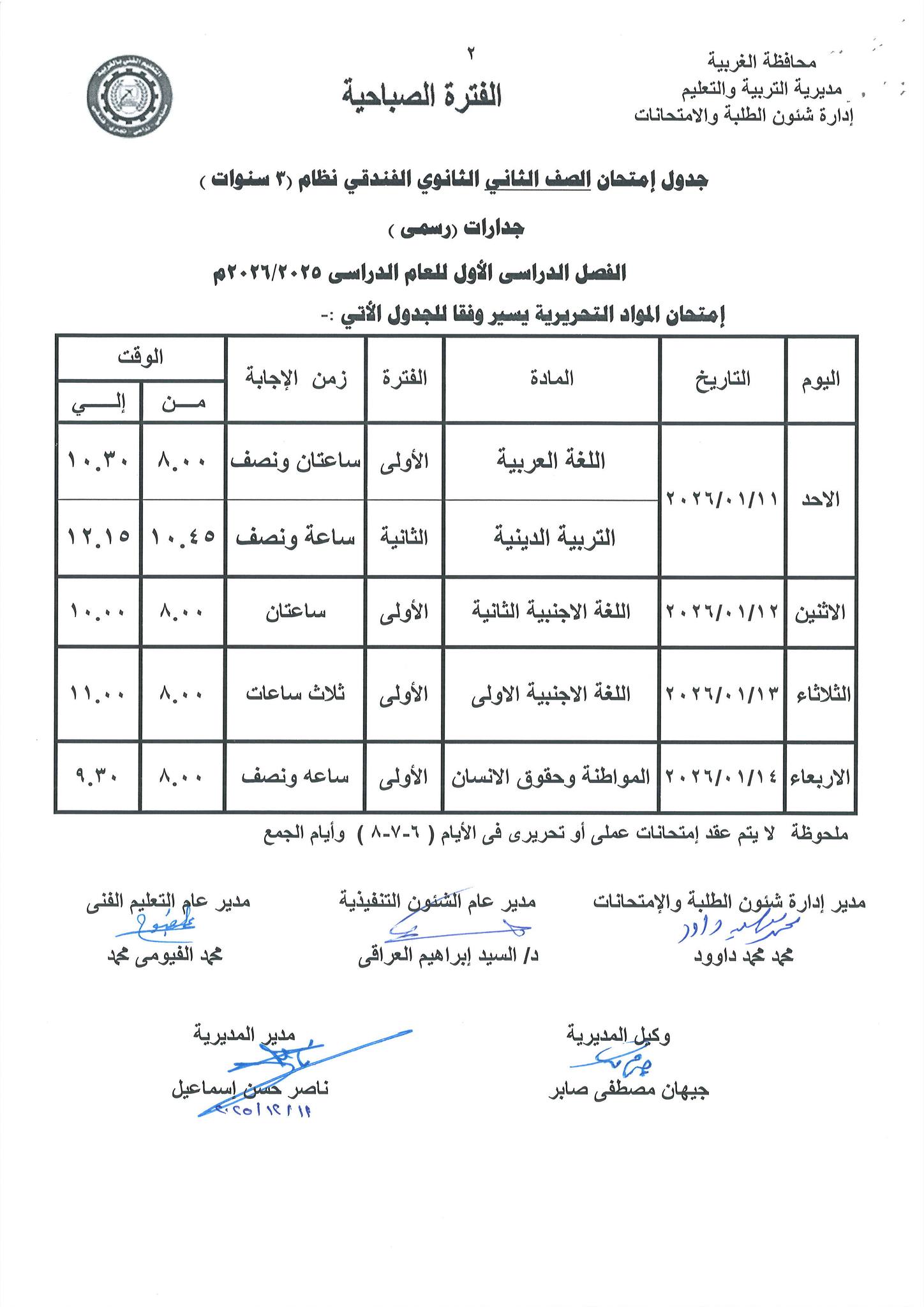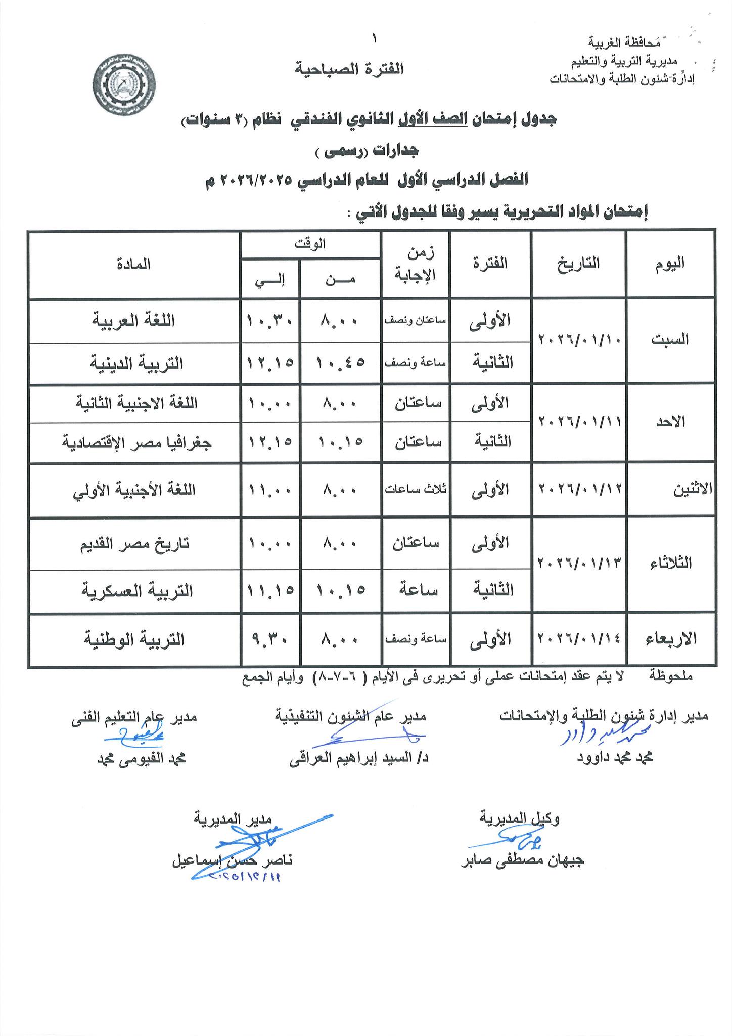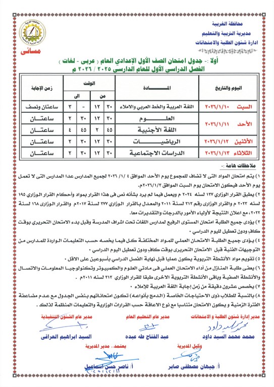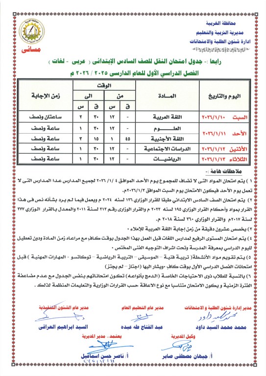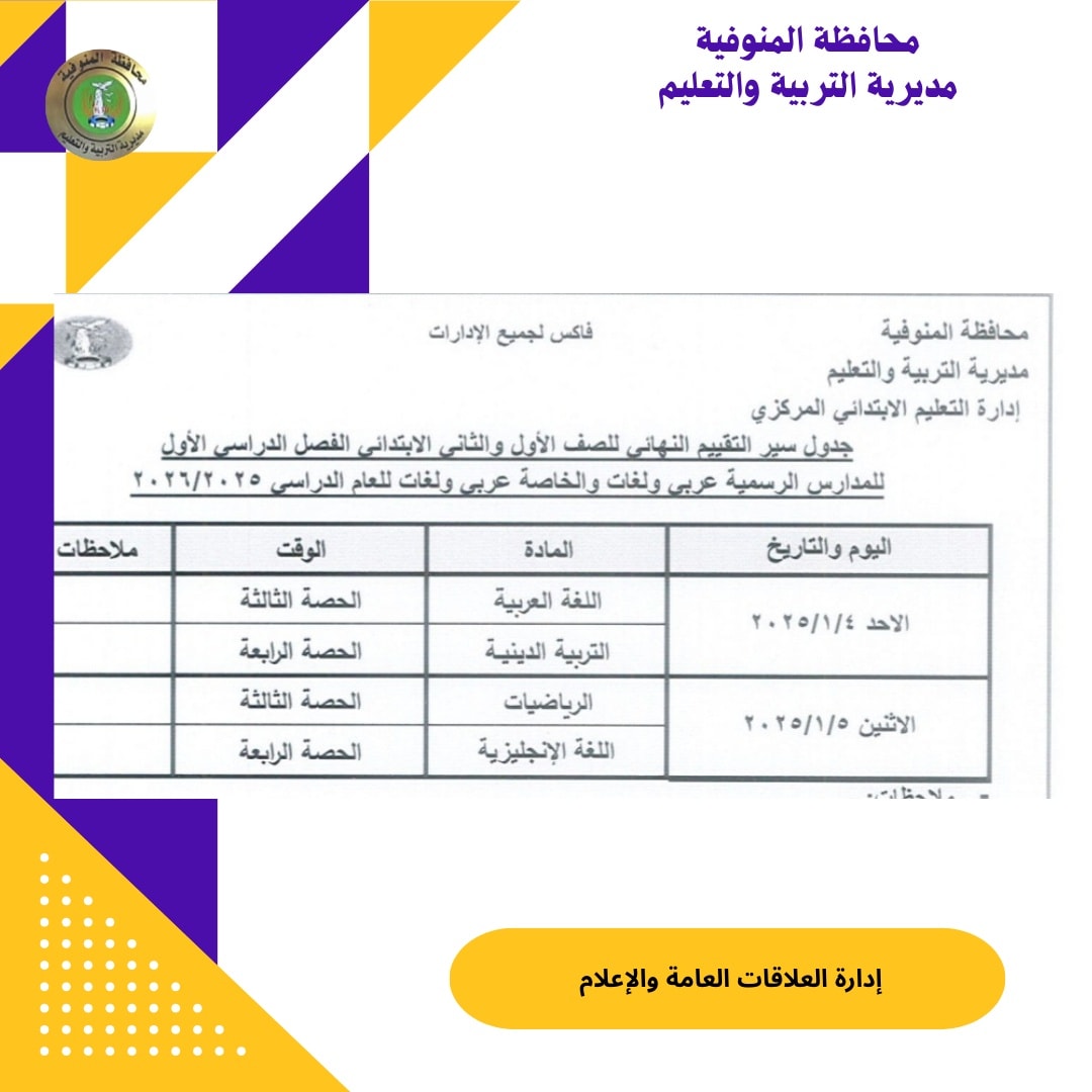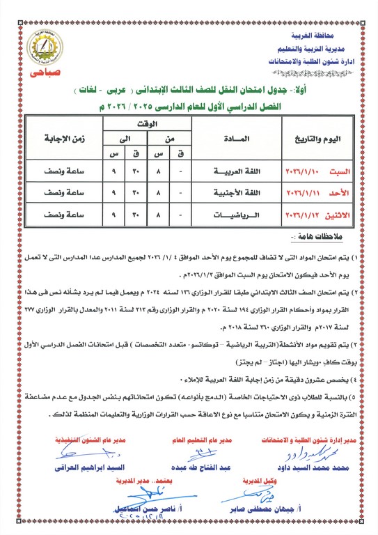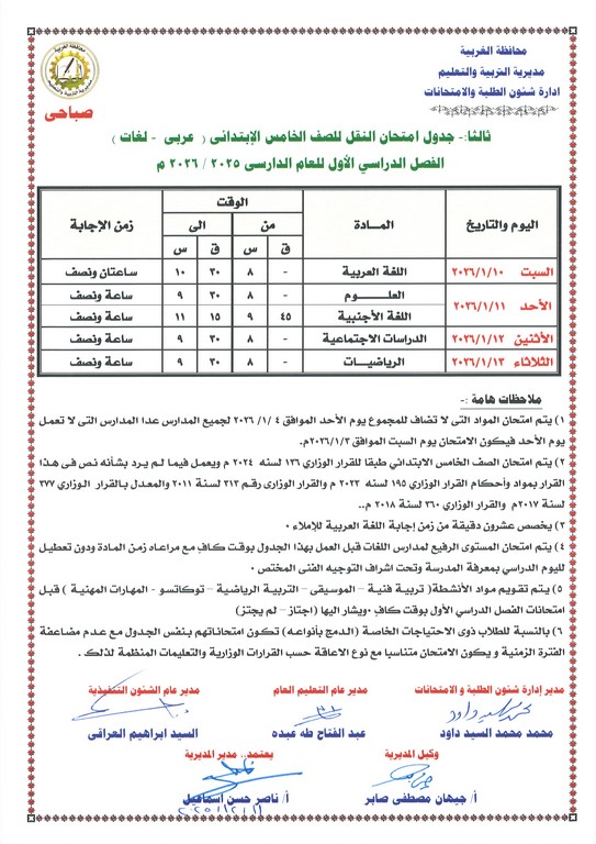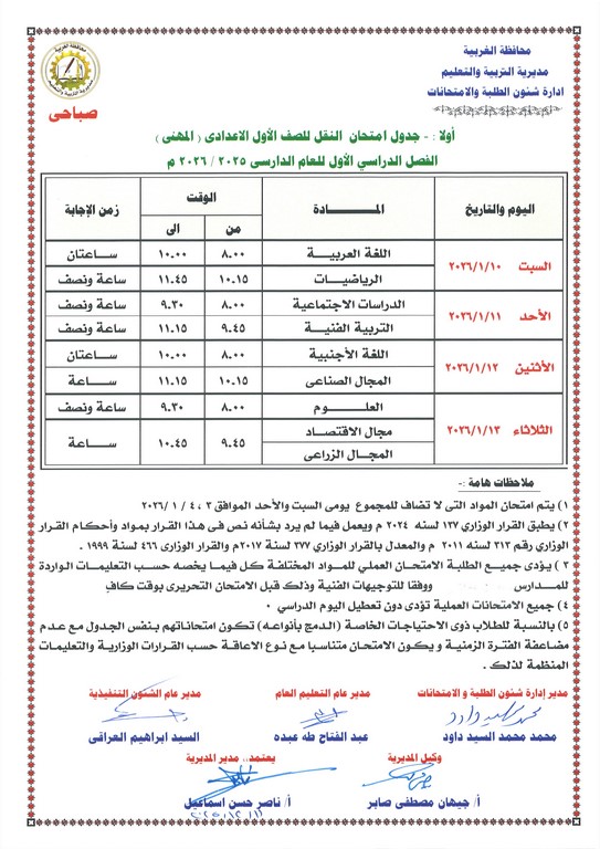 حيث تتولى كل مديرية من مديريات التربية والتعليم إعلان جدول امتحانات نصف العام 2026 جميع المراحل في بيان رسمي يتم نشره على الصفحة الرسمية لكل مديرية على موقع فيس بوك ، وذلك بعد اعتماد جدول امتحانات نصف العام 2026 جميع المراحل من المحافظ