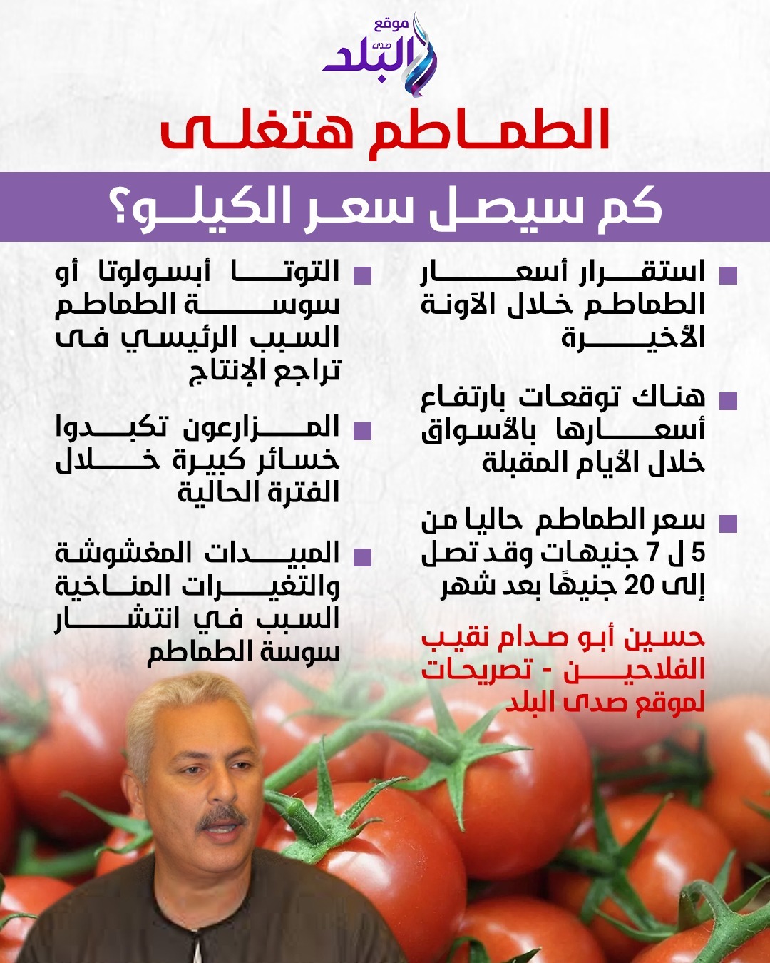 وتوقع نقيب الفلاحين إنتاج الطماطم بالأسواق وبالتالى ترتفع أسعارها ليصل سعرها إلى 20 جنيهًا، ناصحا المواطنين بالإقبال على التخزين خلال الفترة الحالية.