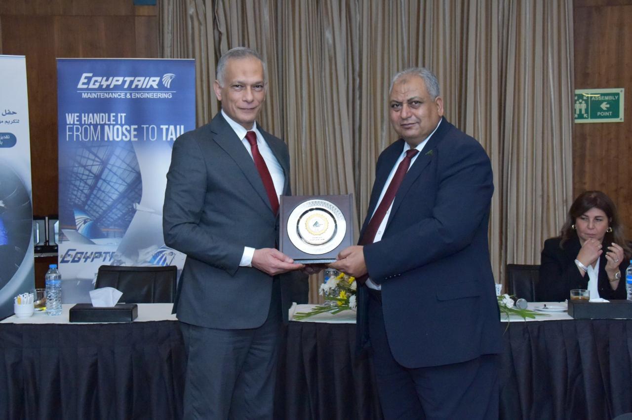 كما قام المهندس مبروك عامر بالإنابة عن المهندس طارق النبراوي نقيب المهندسين بتسليم درع النقابة للمهندس إبراهيم فتحي تقديراً وتكريما لشركة مصر للطيران للصيانة والأعمال الفنية الصرح الهندسي العريق ودورها الريادى فى المنطقه .