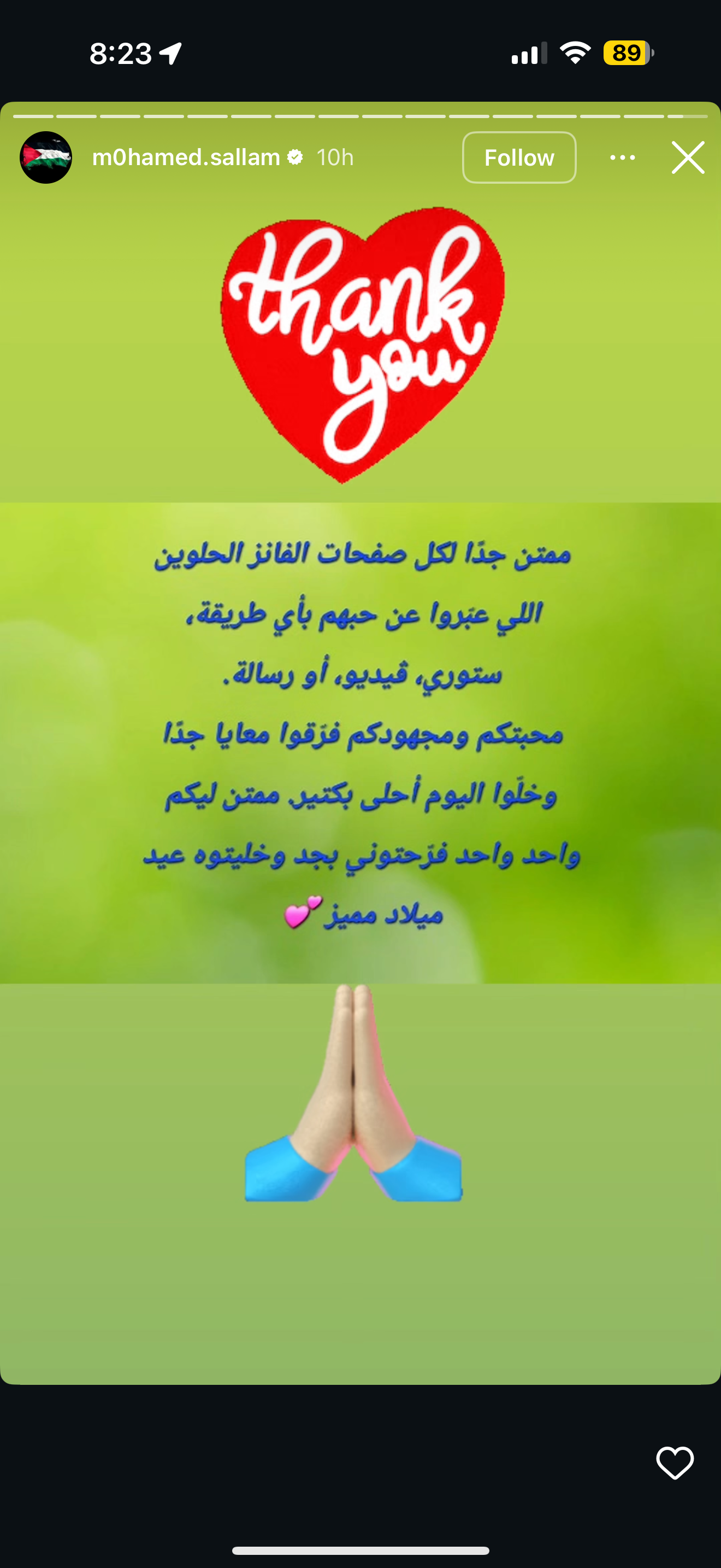 وكتب محمد سلام عبر حسابه على «إنستجرام»، قائلاً: «ممتن جدا لكل صفحات الفانز والمعجبين الحلوين اللى عبروا عن حبهم بأى طريقة، محبتكم ومجهودكم فرقوا معايا جدًا، وخلوا اليوم أحلى بكتير.، ممتن ليكم واحد واحد، فرحتونى بجد وخليتوه عيد ميلاد مميز».