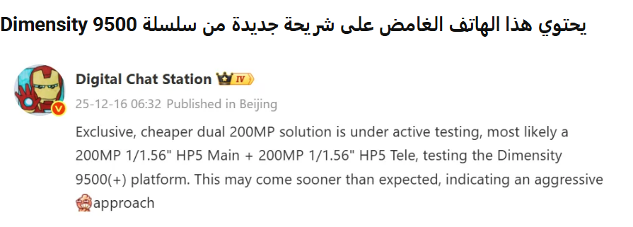 يحتوي هذا الهاتف الغامض على شريحة جديدة من سلسلة Dimensity 9500 وتشير هذه التسريبات الجديدة من مصدر موثوق، Digital Chat Station، إلى أن الهاتف الغامض يعمل بمعالج Dimensity 9500 ويُلمح وجود علامة "+" في نهاية اسم الهاتف إلى أنه قد يكون نسخة مُحسّنة من معالج Dimensity 9500 الحالي.